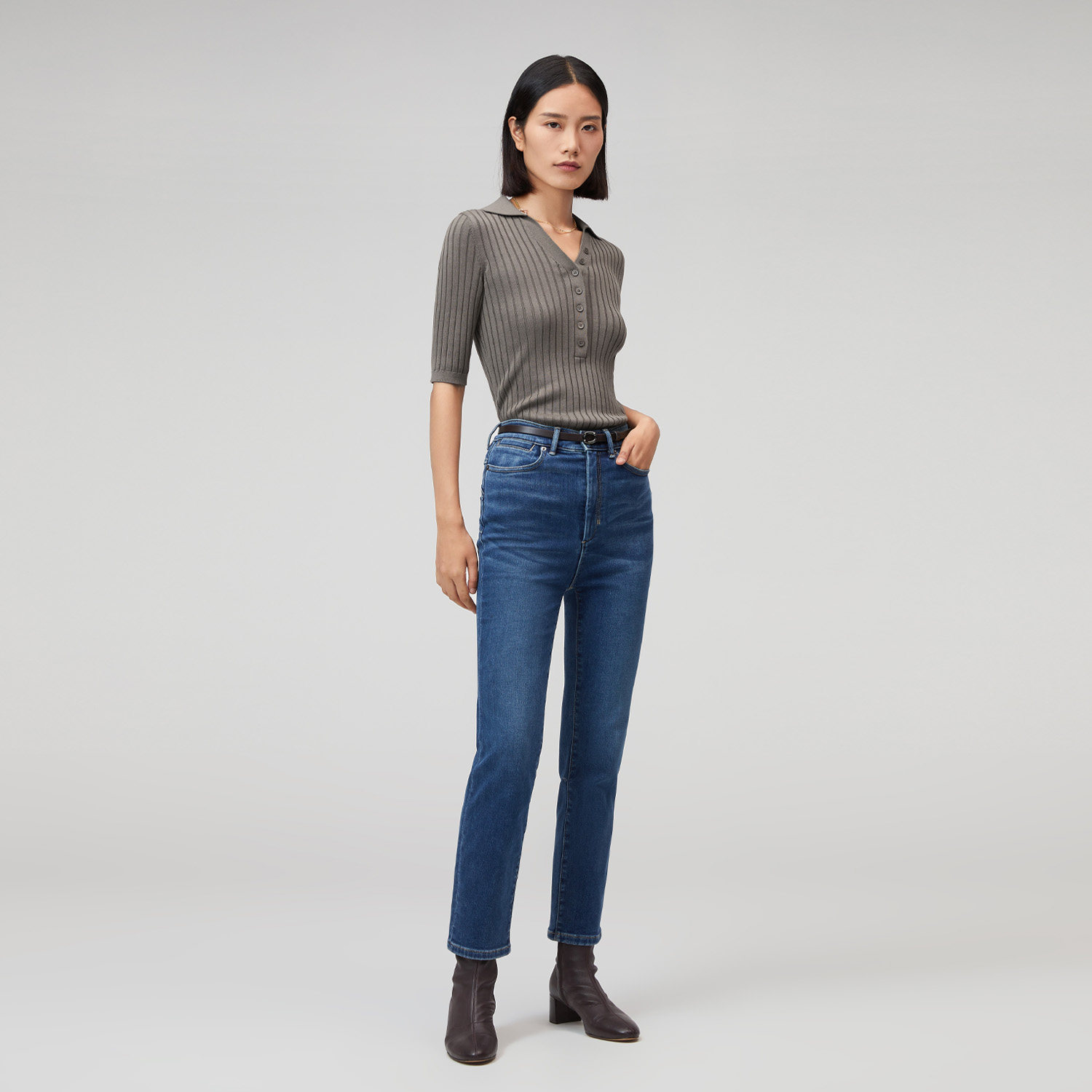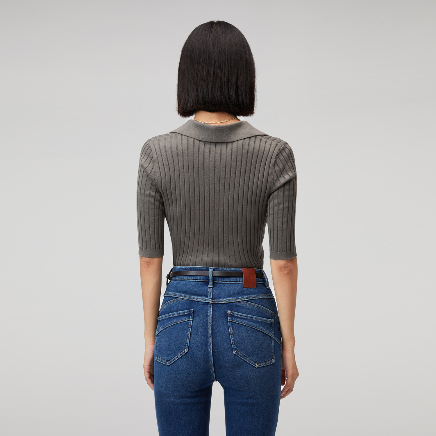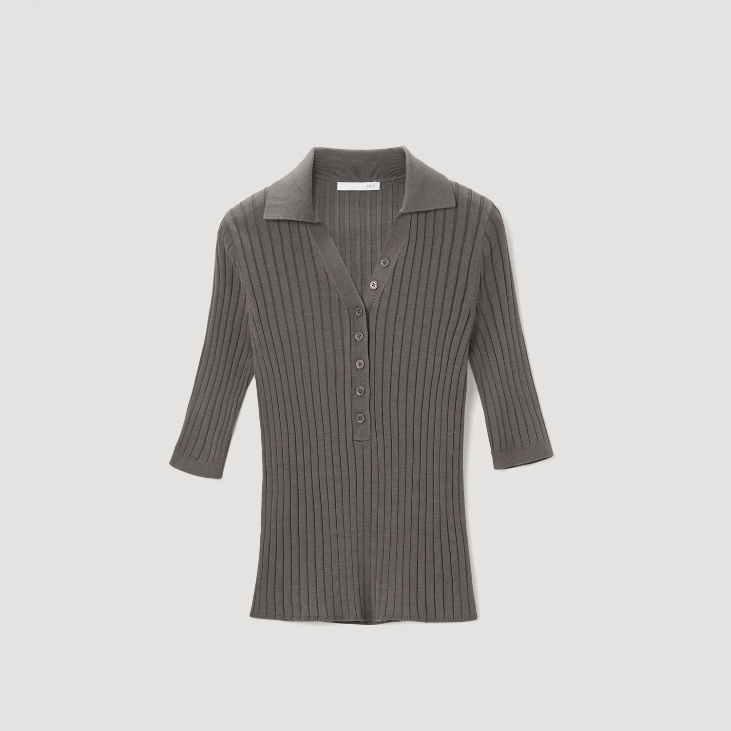 OVV秋冬新款女装丝棉混纺POLO领罗纹修身中袖针织衫