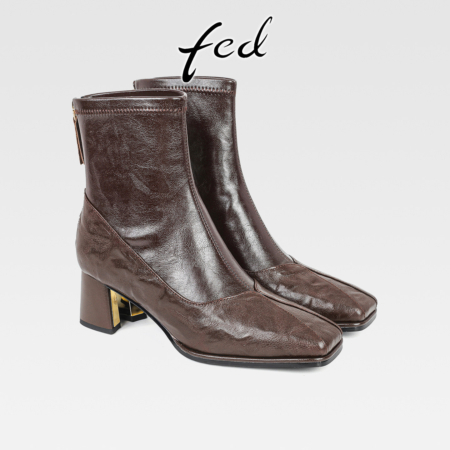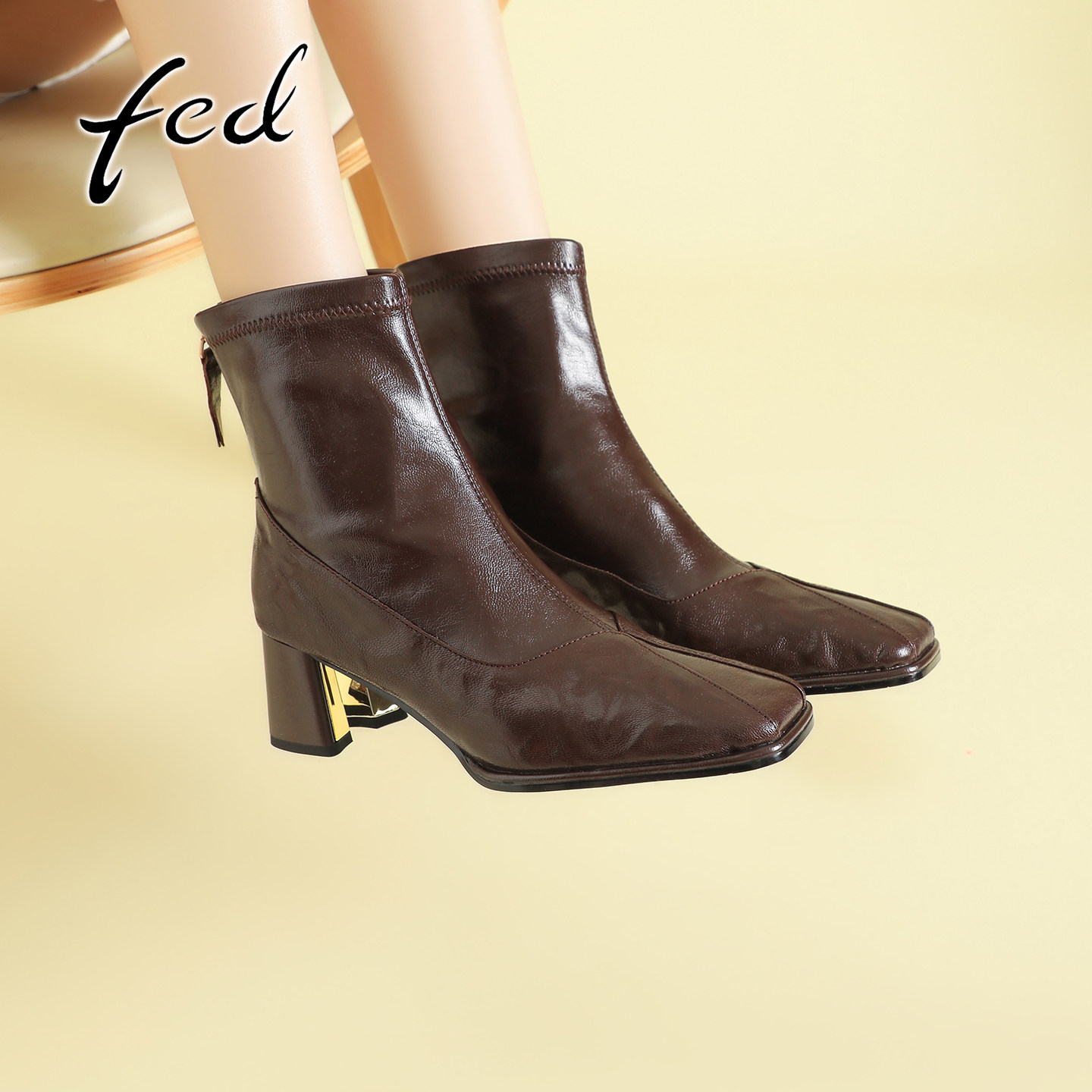 fed复古羊皮粗跟弹力瘦瘦靴女秋冬款后拉链方头高跟巨好看小短靴