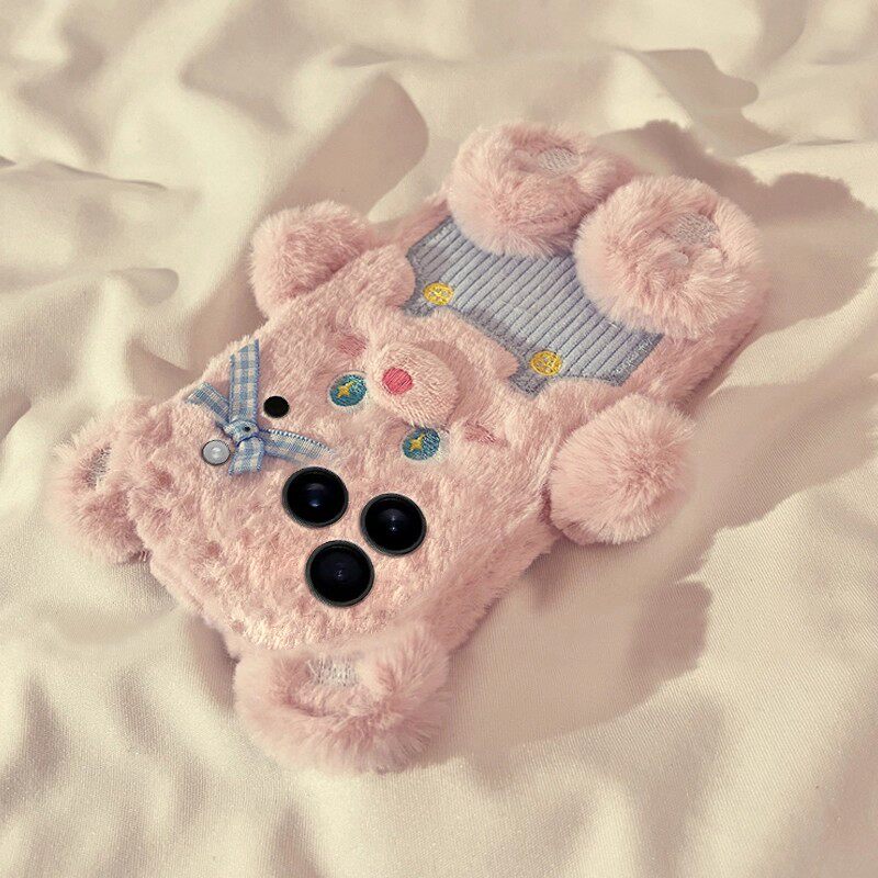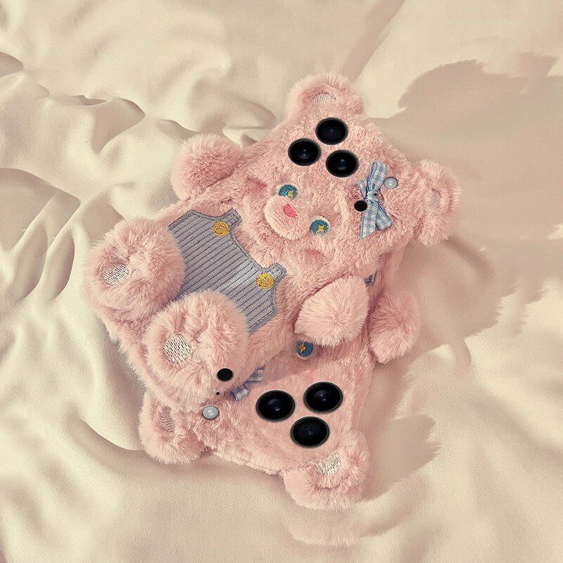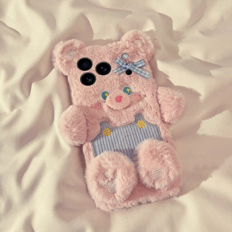 手机壳秋冬毛绒可爱卡通背带裤小熊