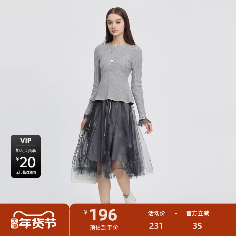 S·DEER圣迪奥女装秋圆领印花网纱针织衫连衣裙套装S223Z1420