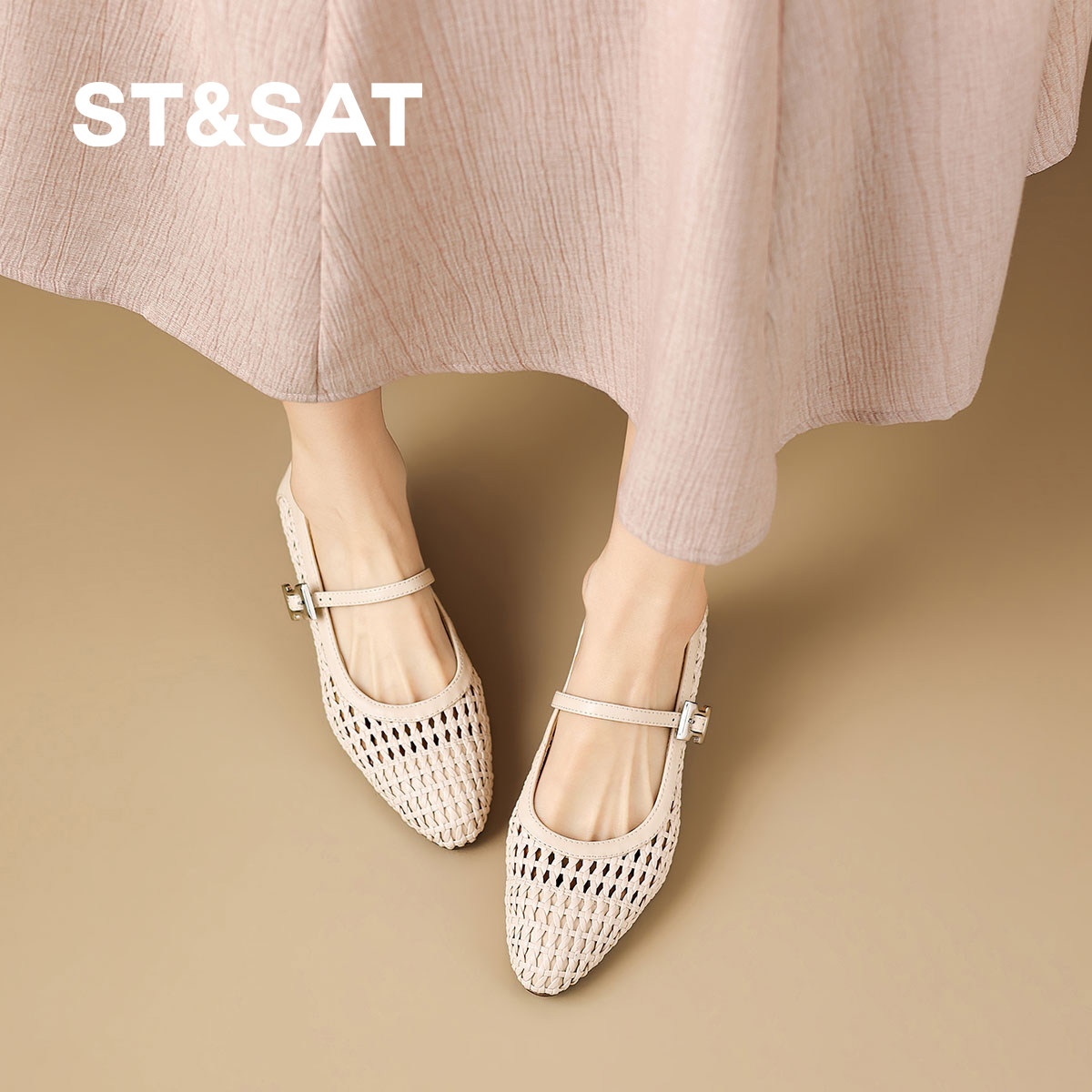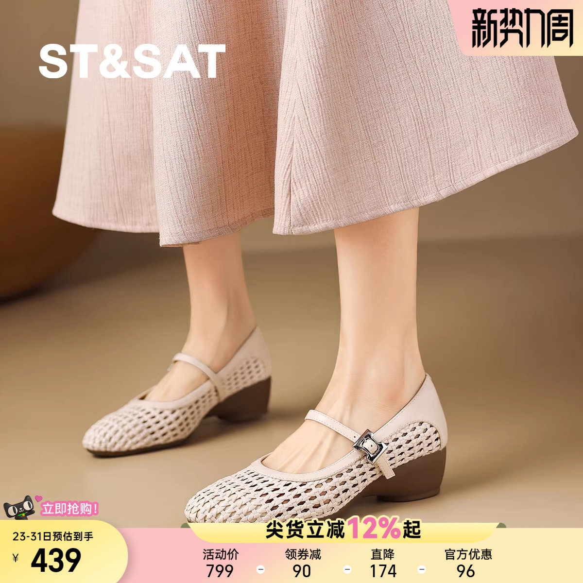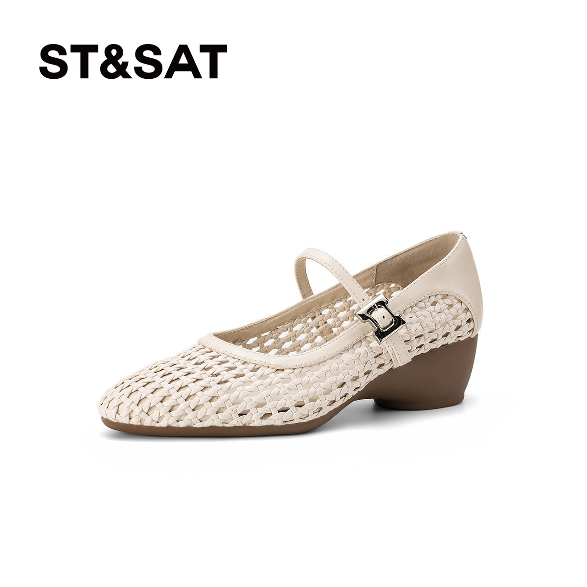 星期六浅口女单鞋2026新款中跟一字带白色镂空透气玛丽珍编织女鞋