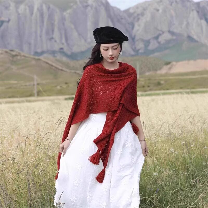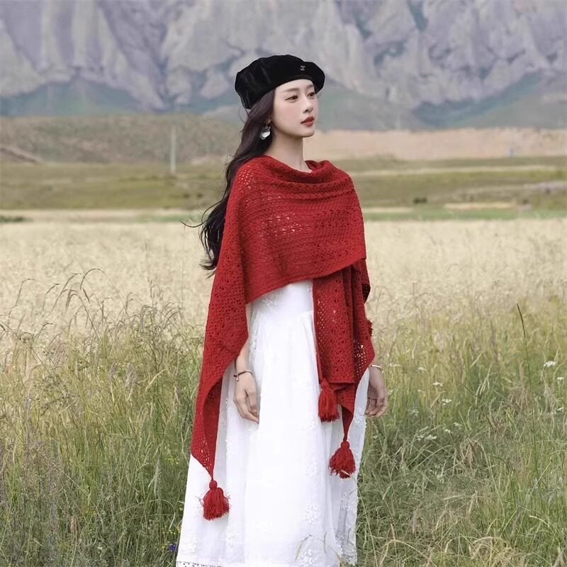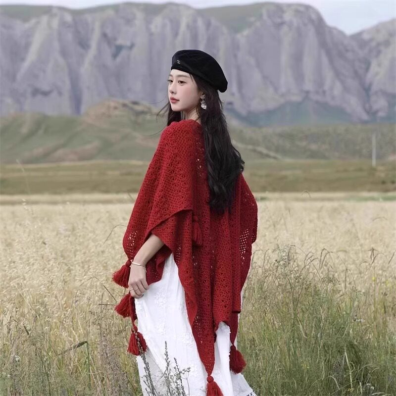 百搭民族风草原镂空披肩女2025新款外搭酒红色针织气质斗篷流苏