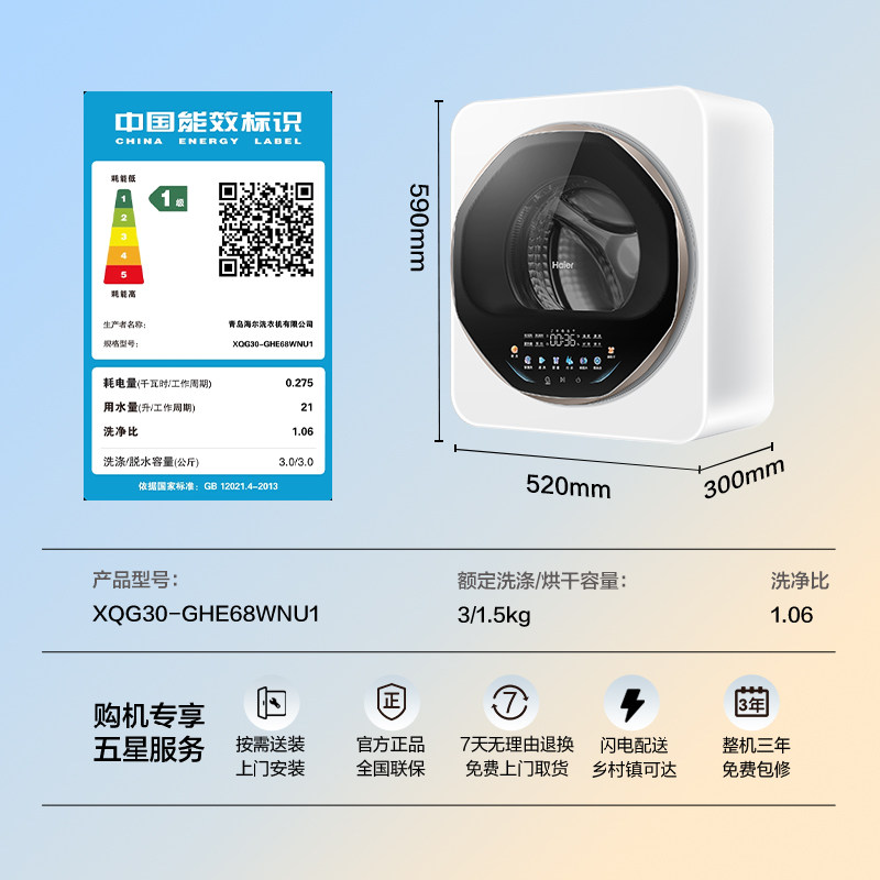 海尔懒人母婴级壁挂小型3KG婴儿童内衣洗烘一体洗衣机68W
