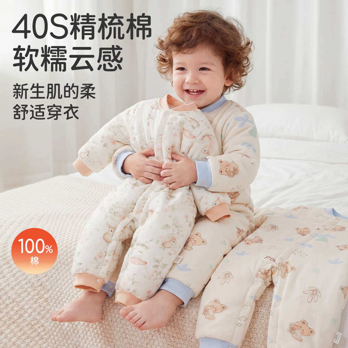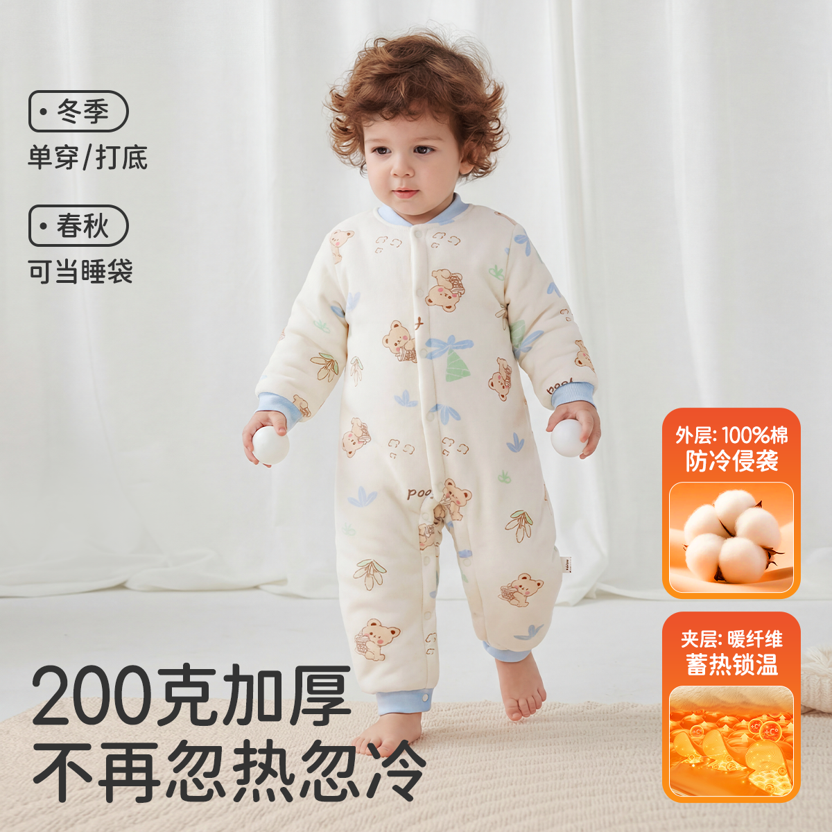贝肽斯婴儿薄夹棉连体衣冬装外出新生幼儿宝宝衣服保暖空气棉睡衣