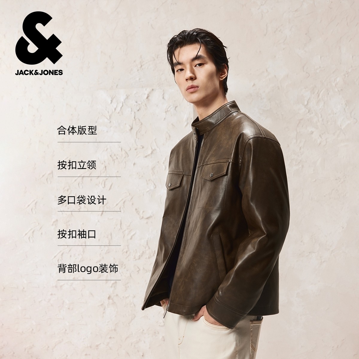 杰克琼斯男装冬季新款羽绒服水洗PU立领宽松帅气机车风休闲外套