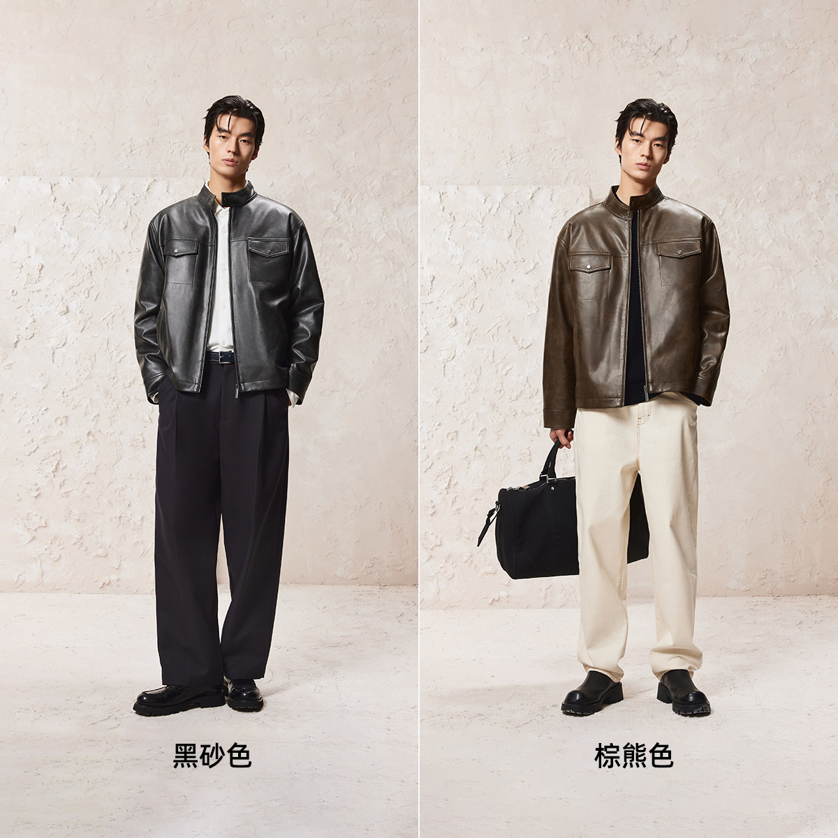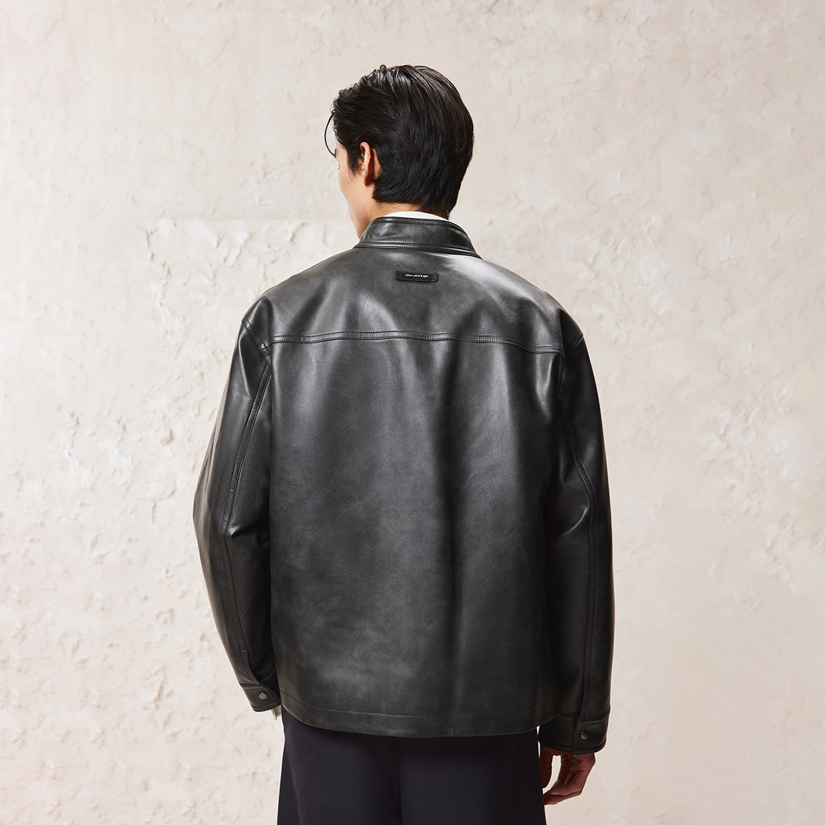 水洗效果PU材质,按扣立领,多口袋设计