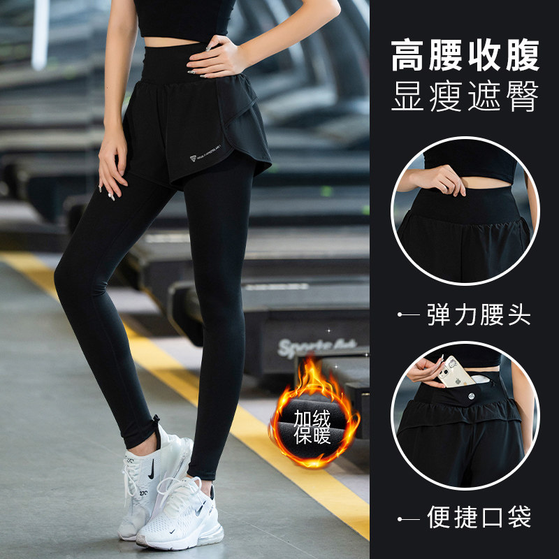 Keep假两件运动长裤健身裤女士专业跑步防卷边加绒收腰瑜伽裤加绒