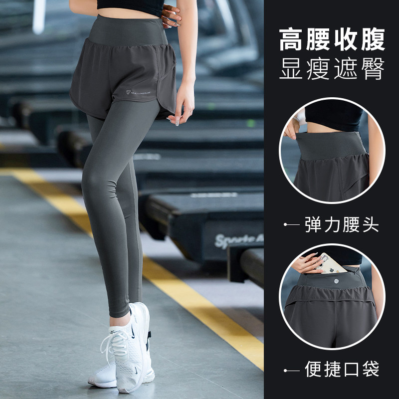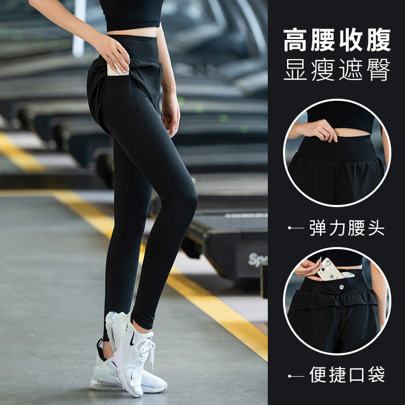 手机瑜伽裤女假两件紧身裤运动训练健身裤高弹速干骑行收腹跑步裤