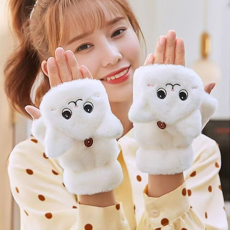 手套女秋冬季可爱骑行潮卡通加绒加厚学生男写字保暖翻盖白色半指