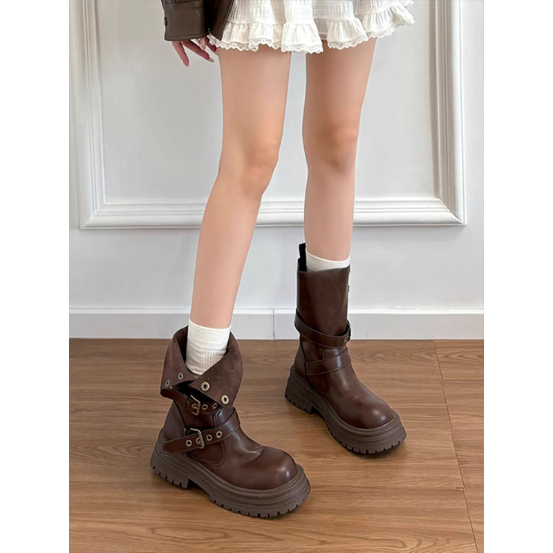 英伦风牛皮真皮厚底美拉德中筒短靴2025新款女马丁靴版~棕色高跟