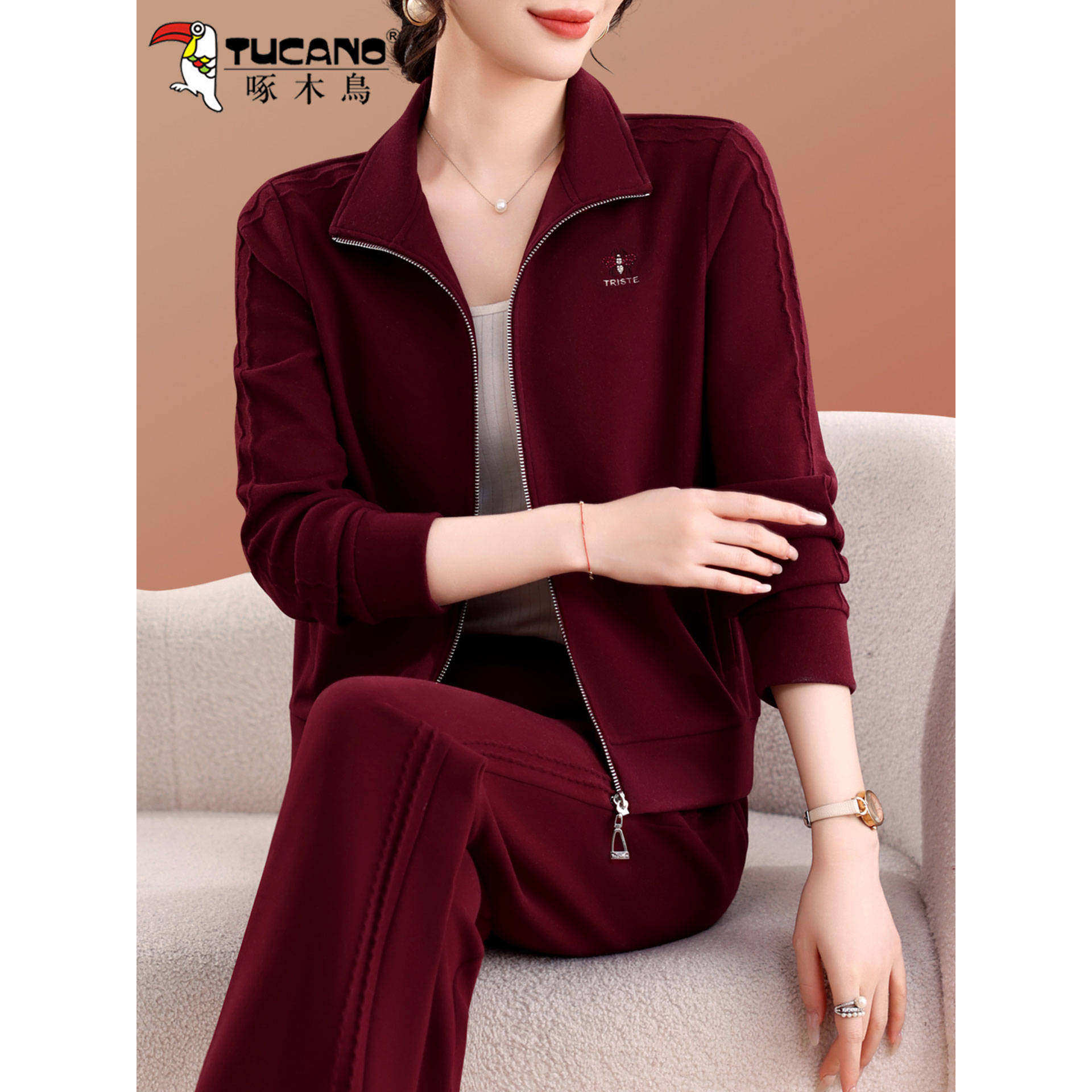 啄木鸟运动服套装女士2026春秋新款开衫卫衣阔腿裤妈妈休闲两件套