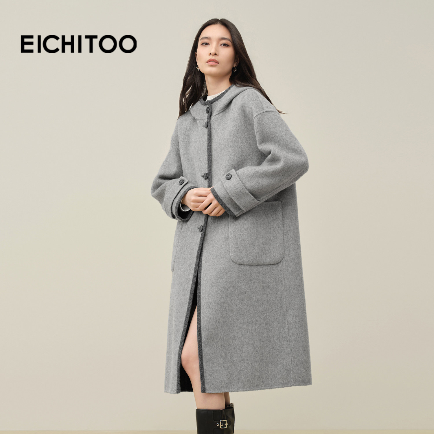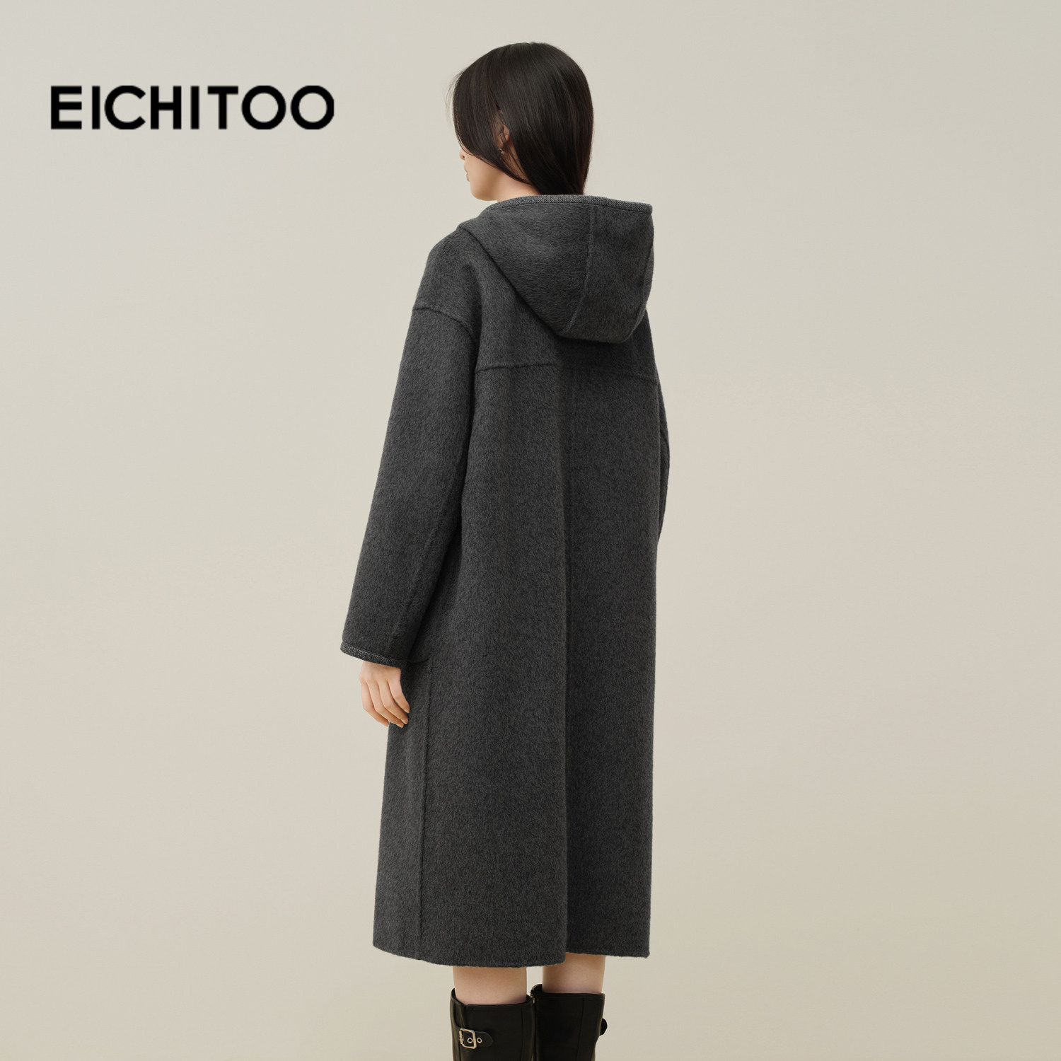 爱居兔绵羊毛正反两穿双面呢大衣女2025年冬季新款连帽柔软长外套