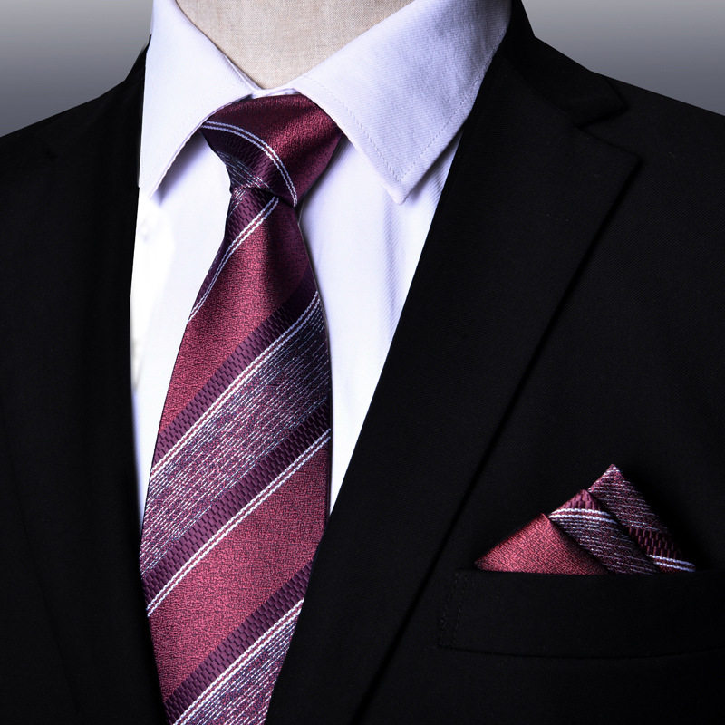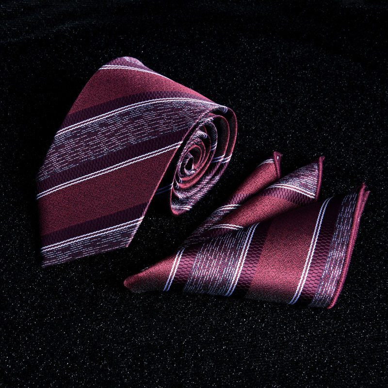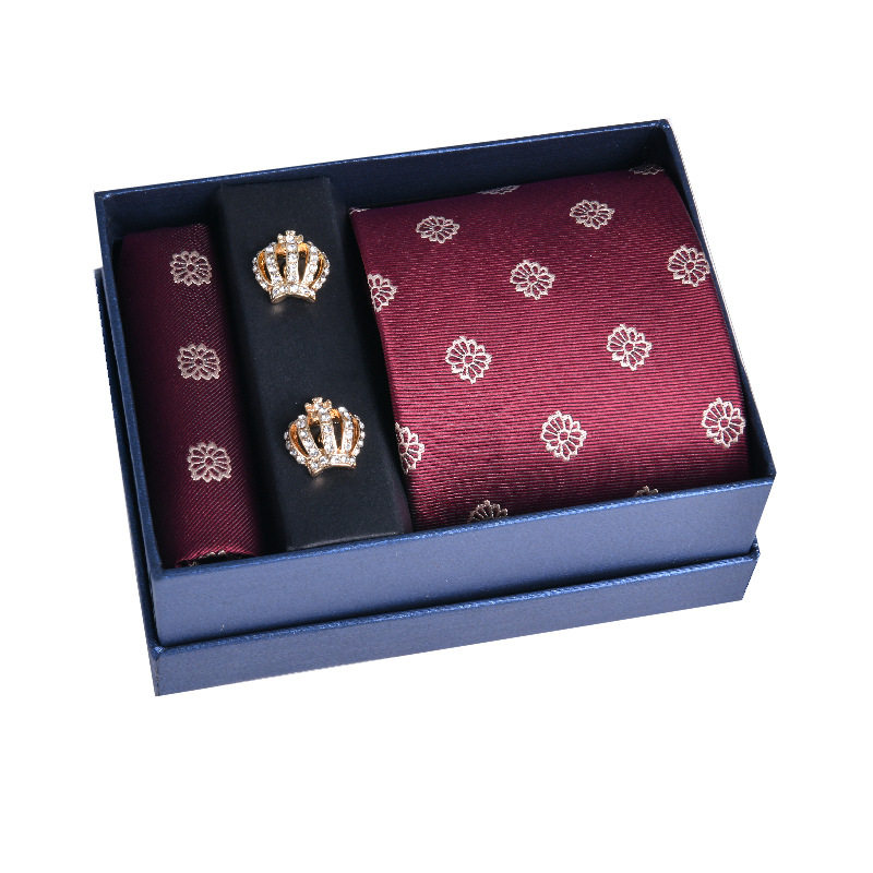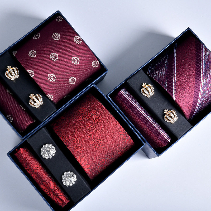 领带方巾袖扣男士红色结婚正装条纹新郎喜庆 3件套新款礼盒装批发
