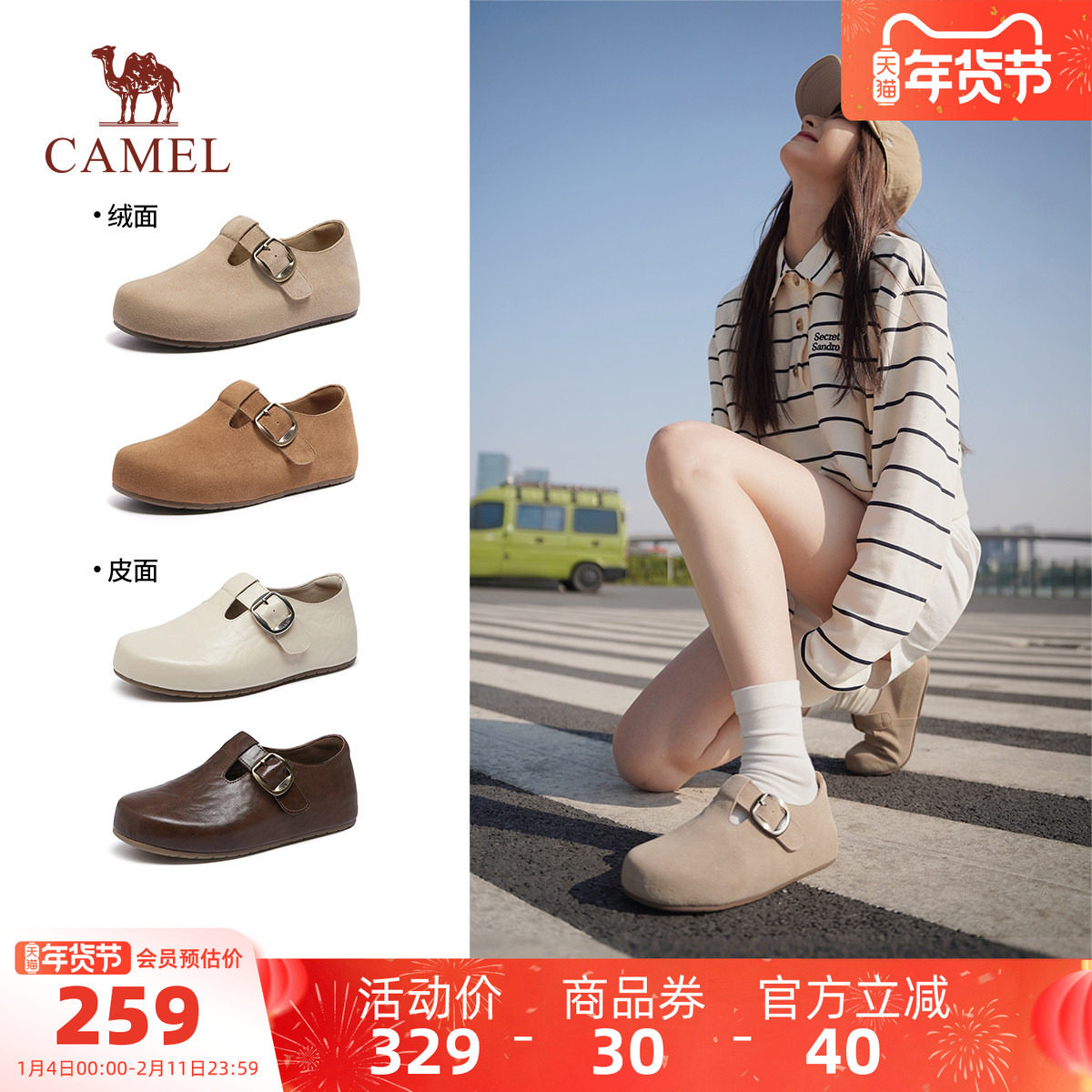 骆驼女鞋2026春季新款懒人一脚蹬复古包头勃肯鞋女玛丽珍平底单鞋