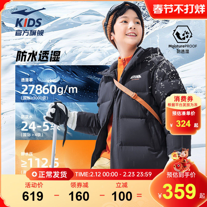 鸿星尔克童装儿童羽绒服冬季中长款加厚男童三防保暖大童冬装外套