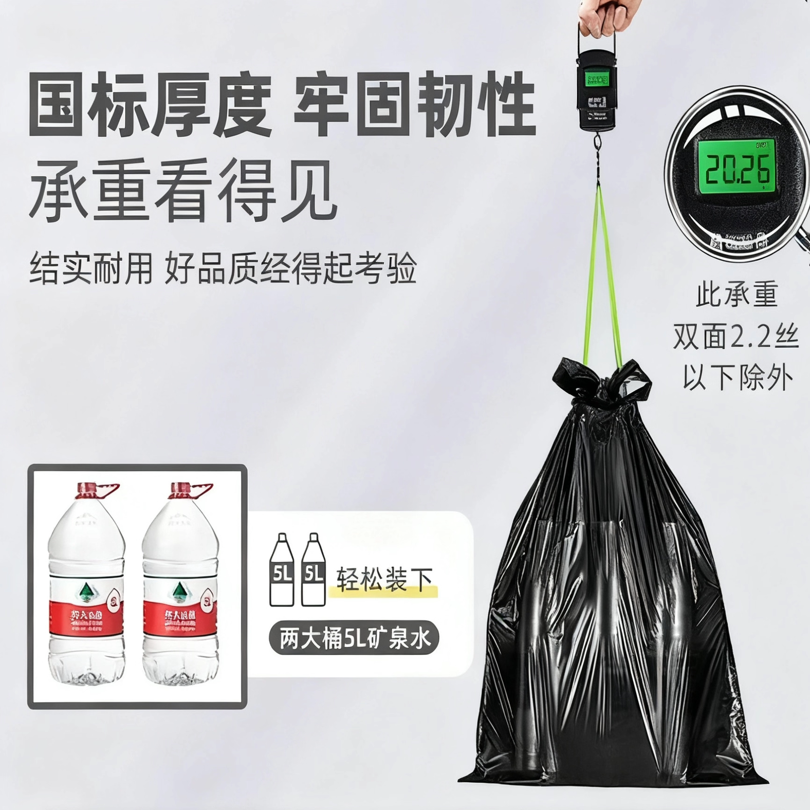 靓涤免撕抽绳式黑色家用垃圾袋加厚手提式收口大塑料袋办公室用