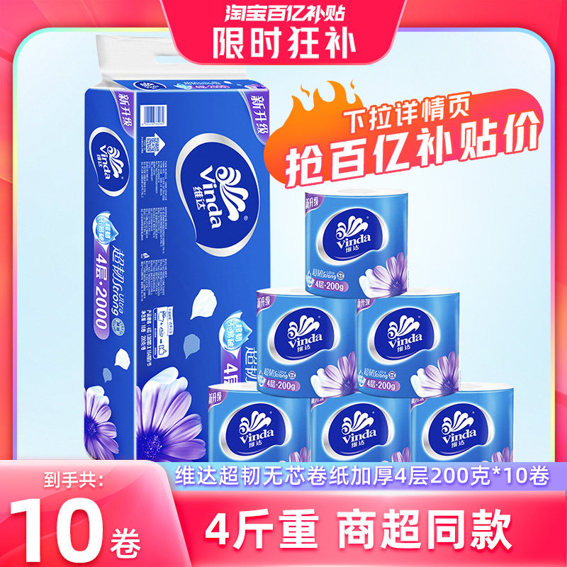 维达纸巾无芯卷纸超韧4层10卷家用卫生纸实芯卷筒纸厕纸手纸提装
