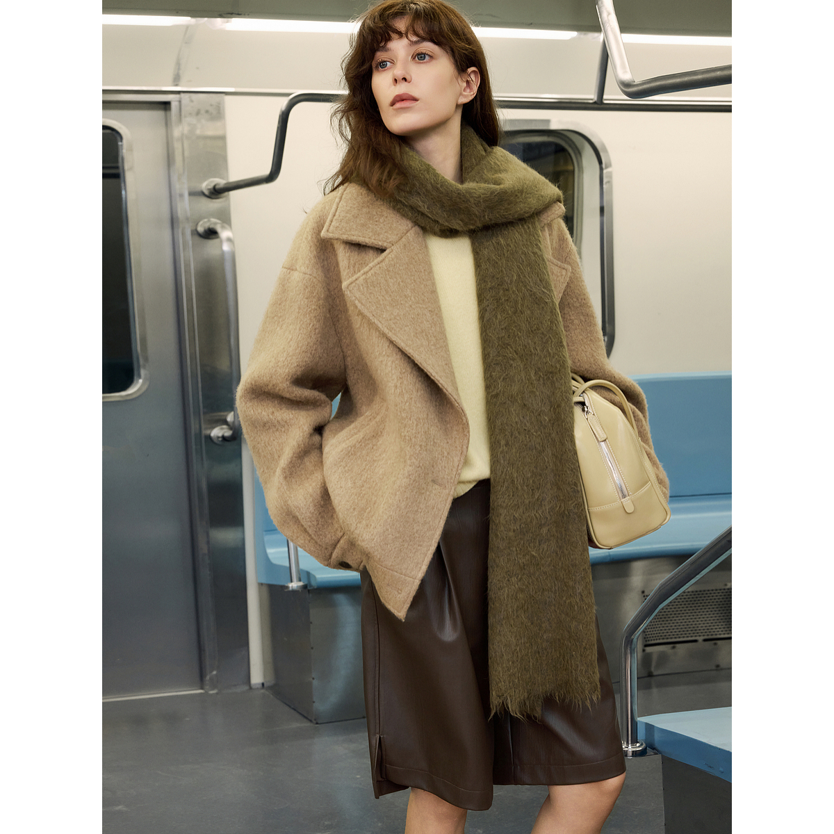 ELLE羊驼毛绵羊毛大翻领双面呢大衣女2025冬新款休闲通勤毛呢外套