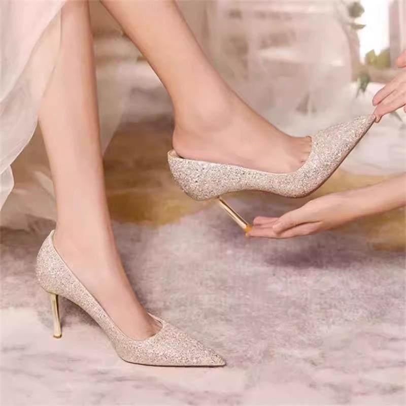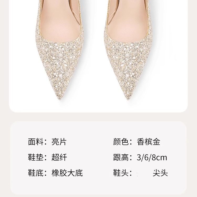 婚鞋女2024年新款主婚纱新娘鞋亮片香槟色水晶鞋尖头细跟高跟鞋女