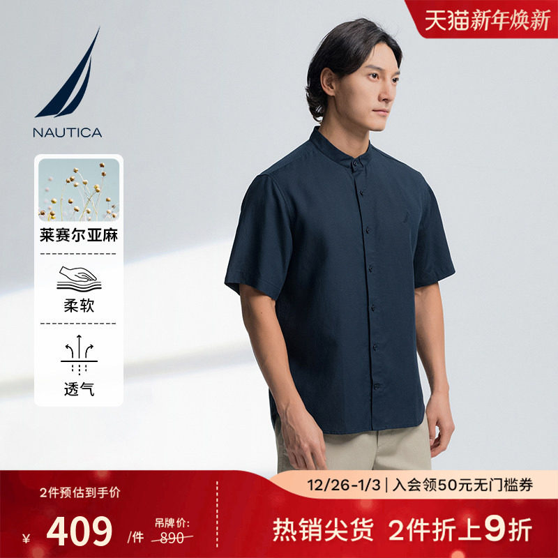 NAUTICA/诺帝卡男装25夏季亚麻混纺透气舒爽小立领衬衫WO5204
