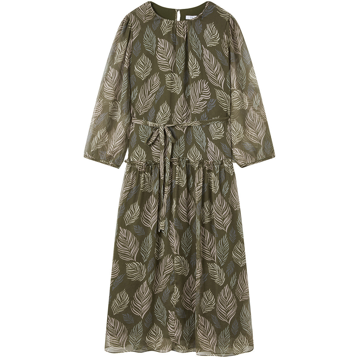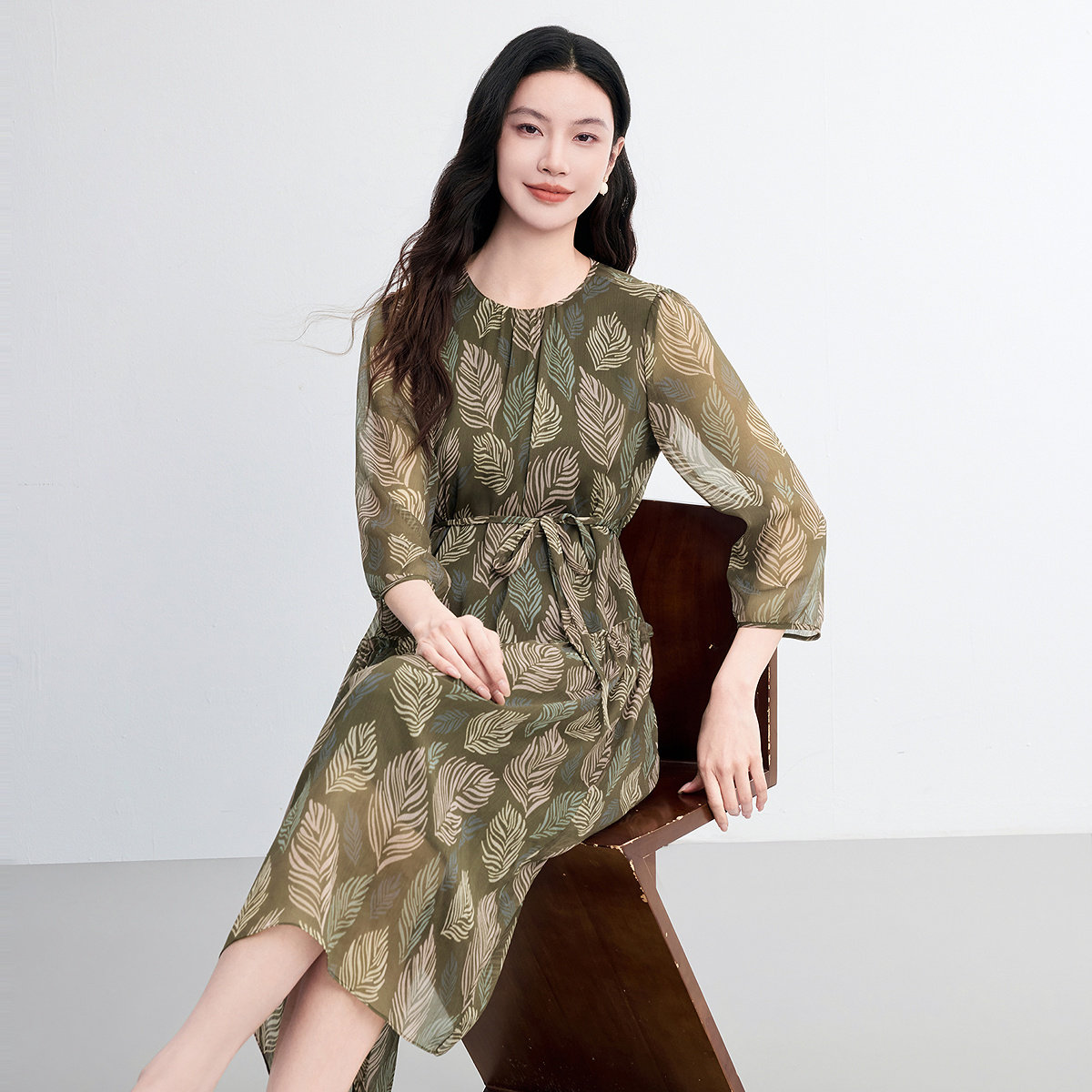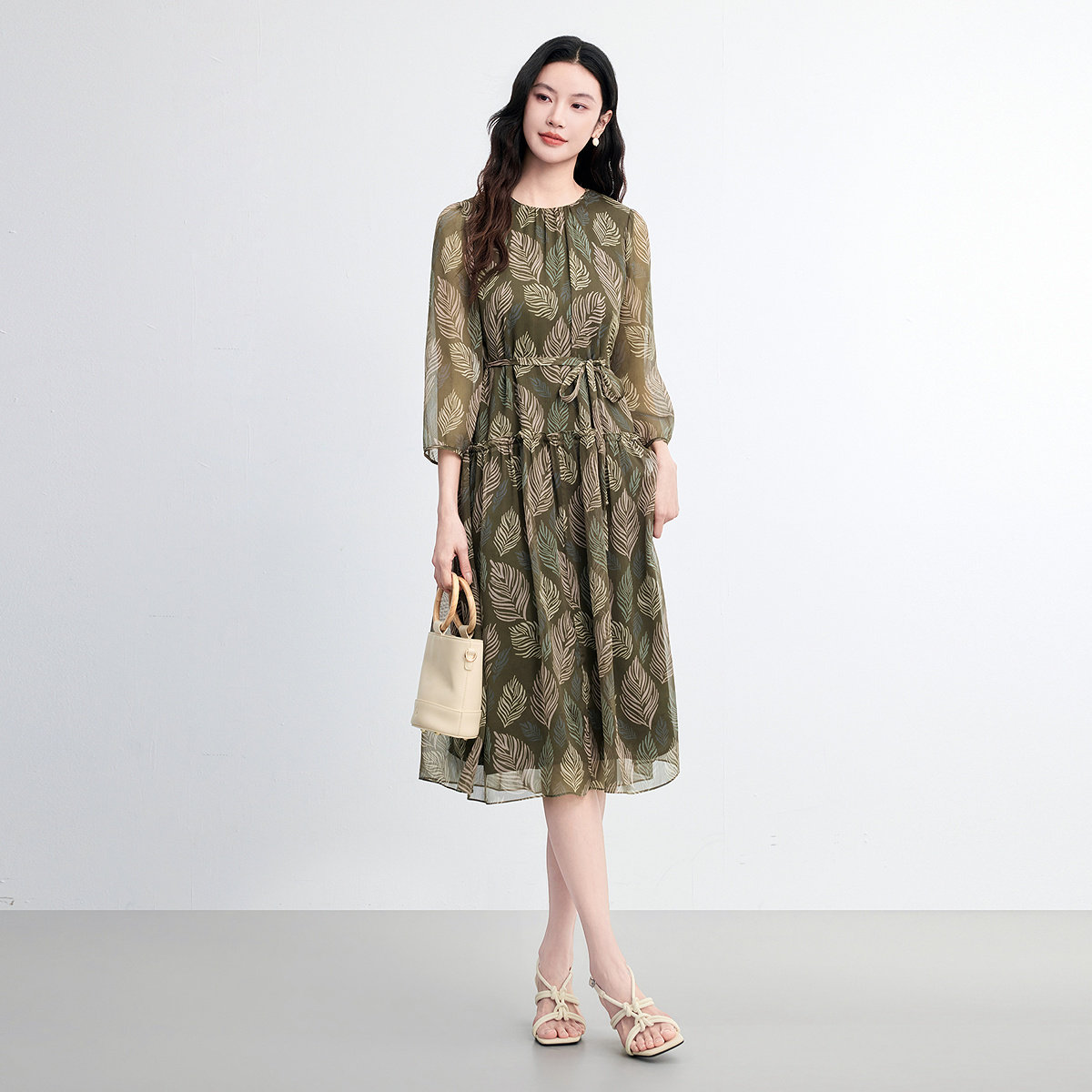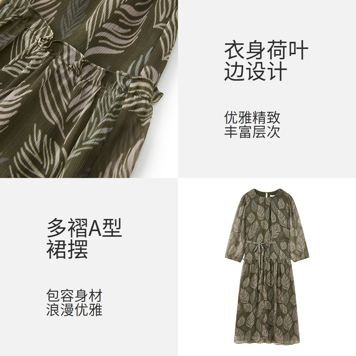 FINITY菲妮迪连衣裙2026春新款简约荷叶边度假风印花雪纺长裙子女
