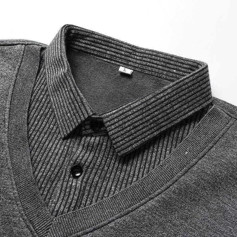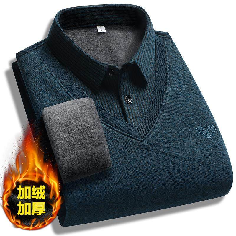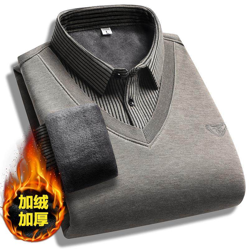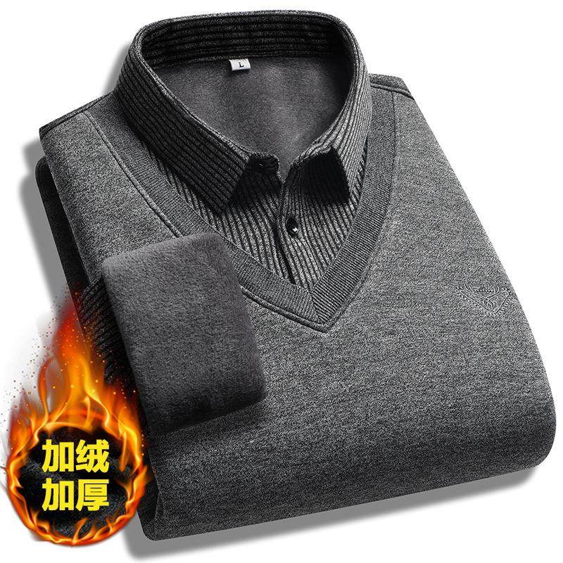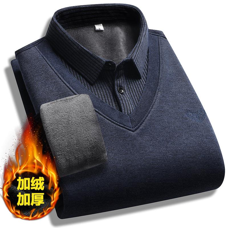 假两件针织打底衫男士冬季加绒加厚保暖衬衫领长袖商务休闲爸爸装