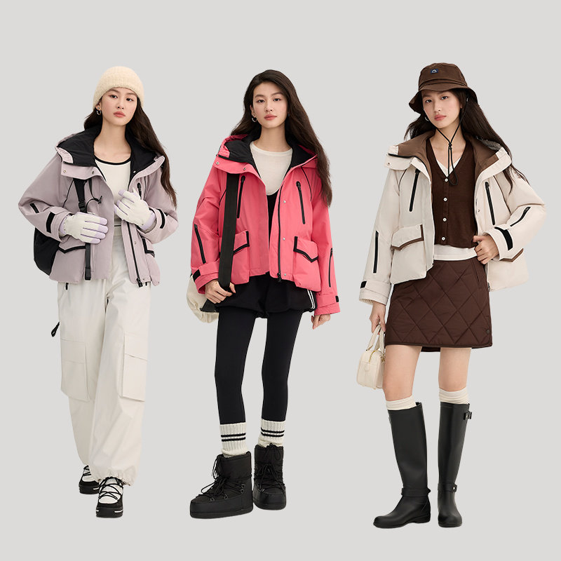 艾莱依鹅绒羽绒服女款新款撞色短款户外登山保暖时尚运动连帽外套