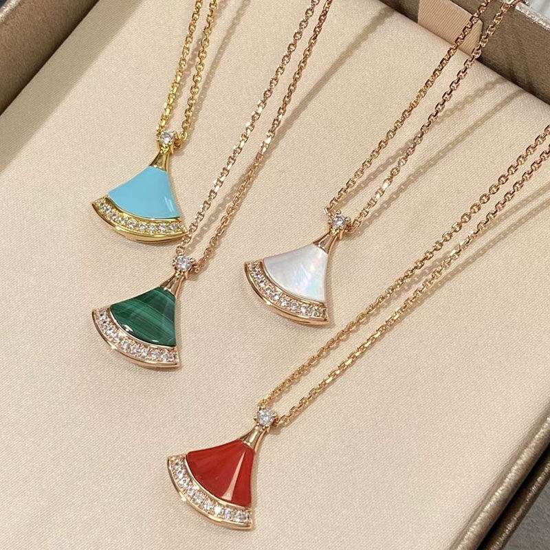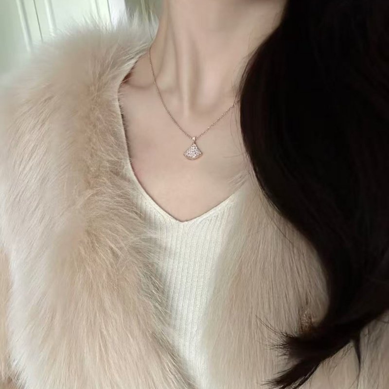 扇形小裙子项链女纯银镀18K金轻奢白贝母满钻锁骨链大扇子吊坠