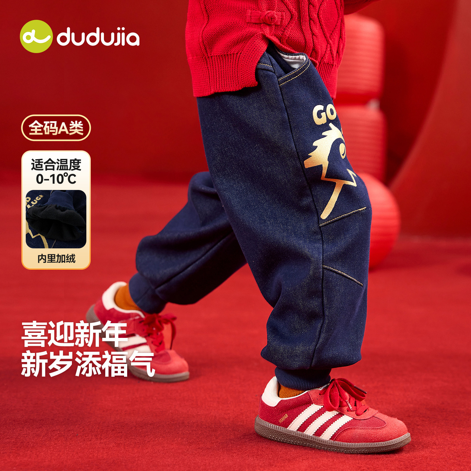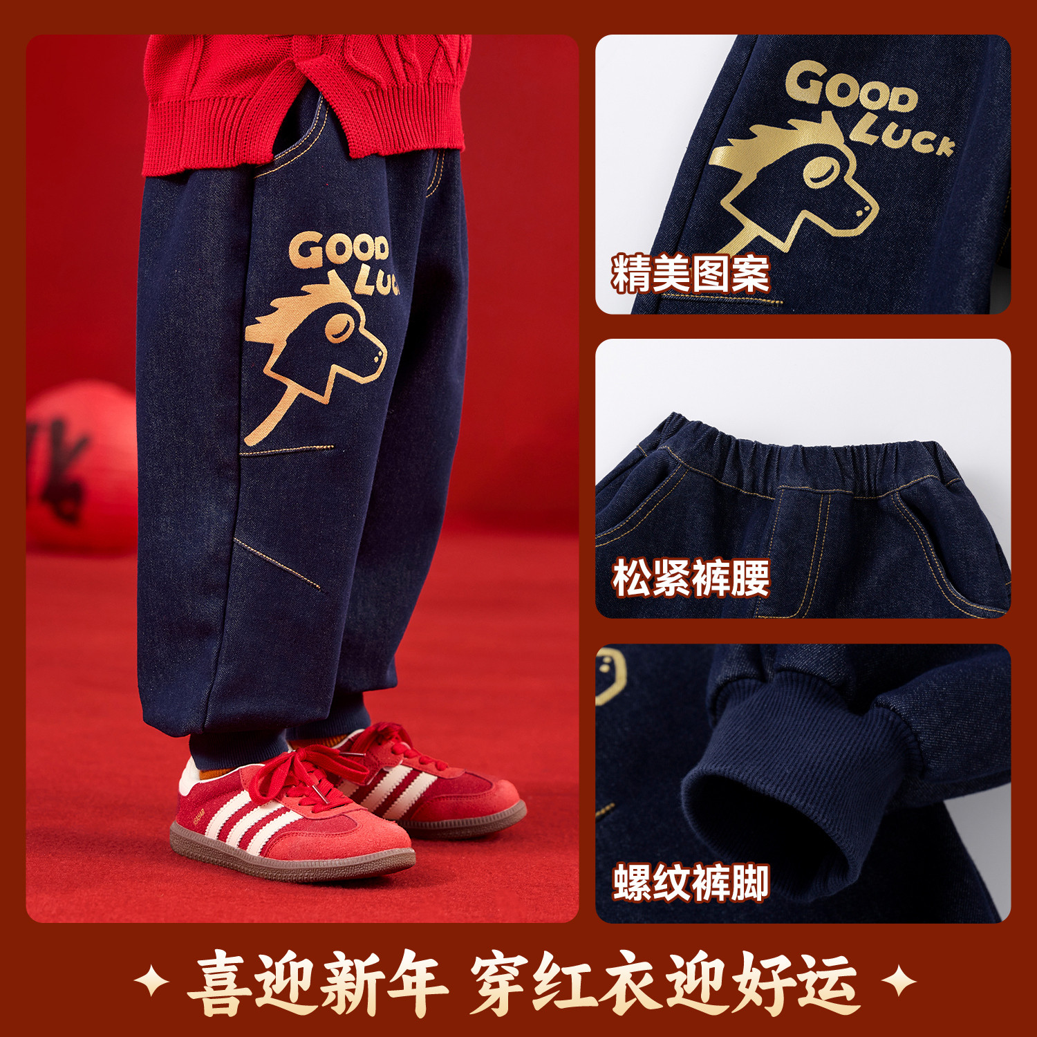 嘟嘟家儿童牛仔裤冬季加绒宝宝唐装裤子男童拜年服喜庆长裤新年装
