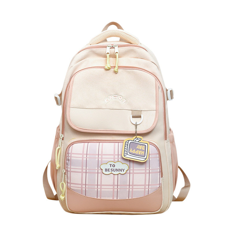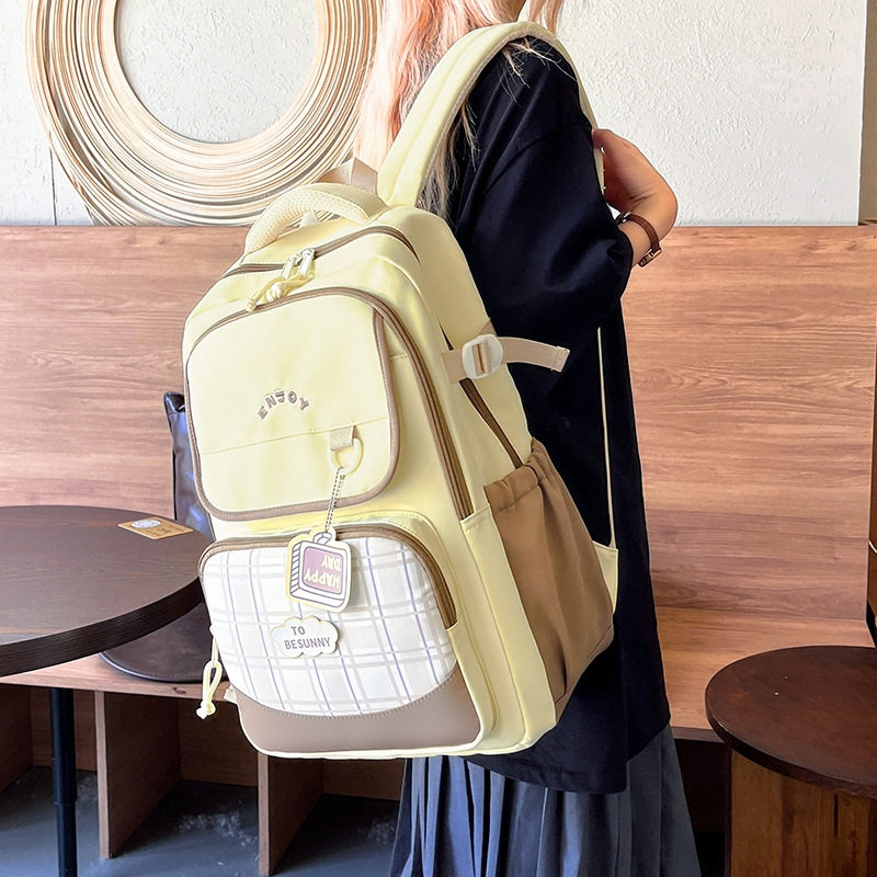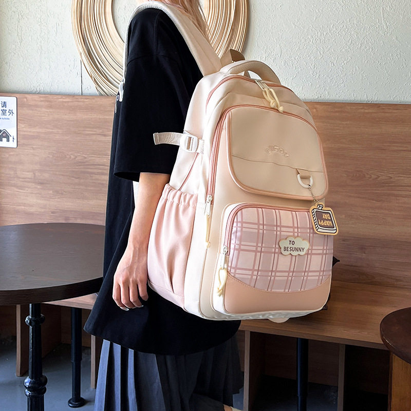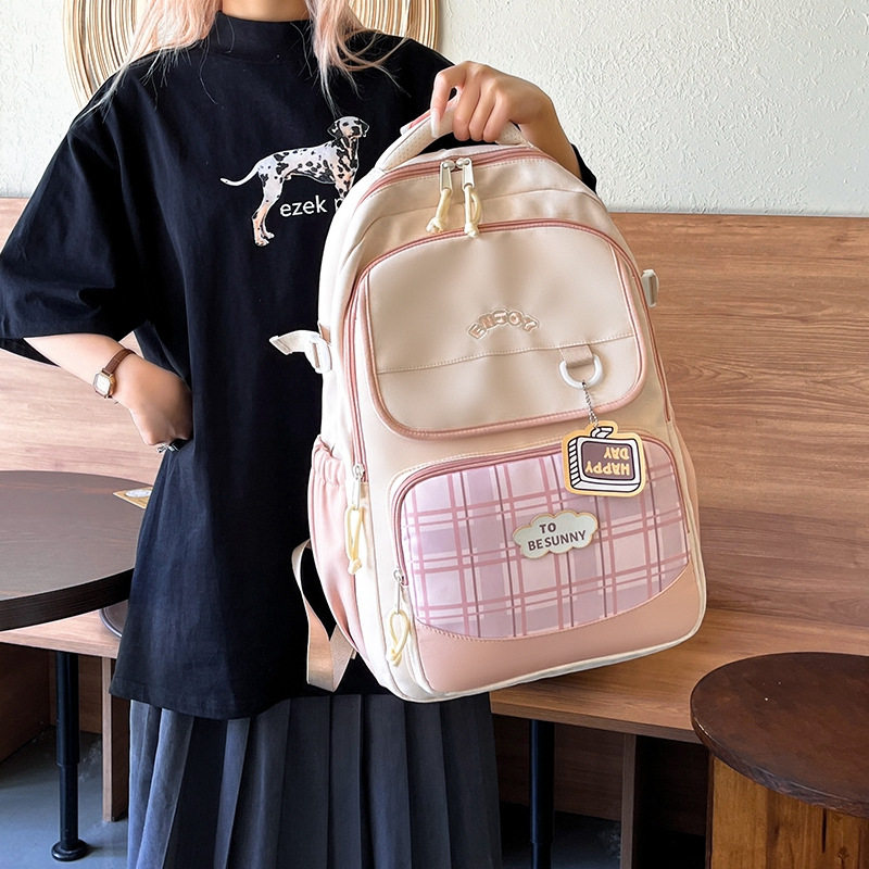 新款日系ins清新甜美撞色拼接格纹背包初高中生轻便大容量双肩包