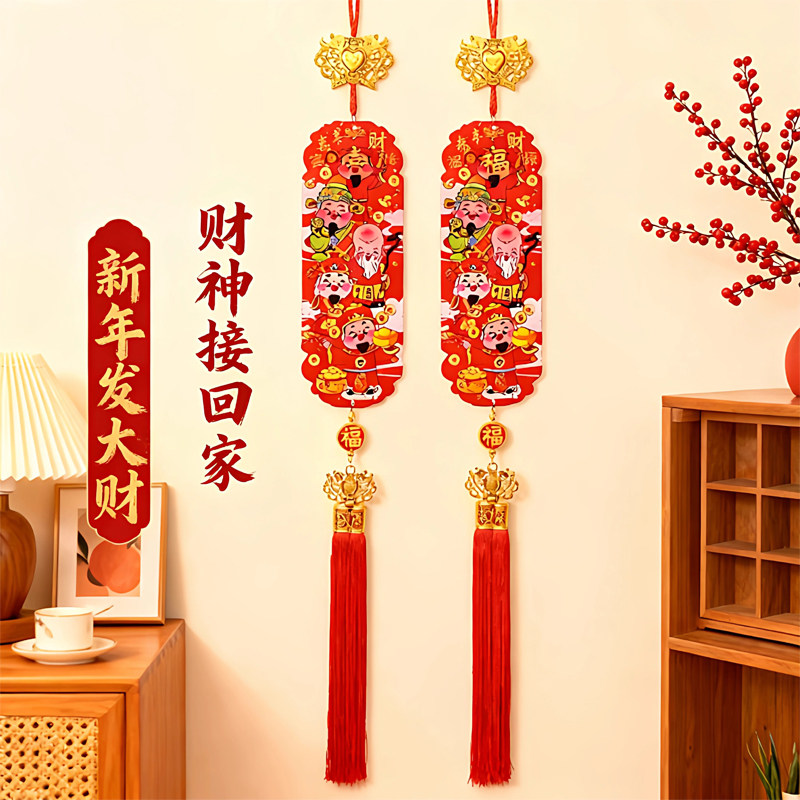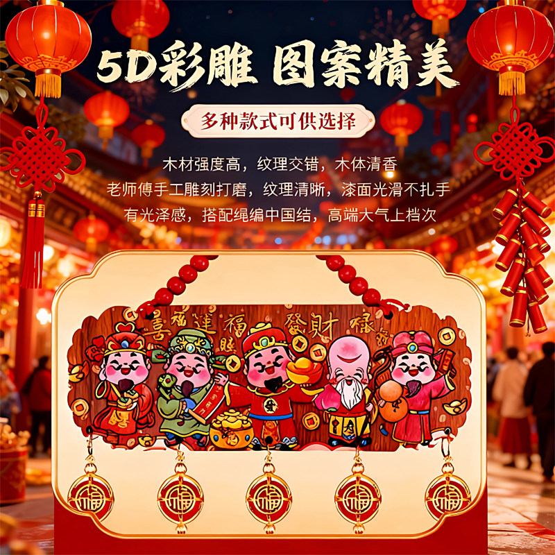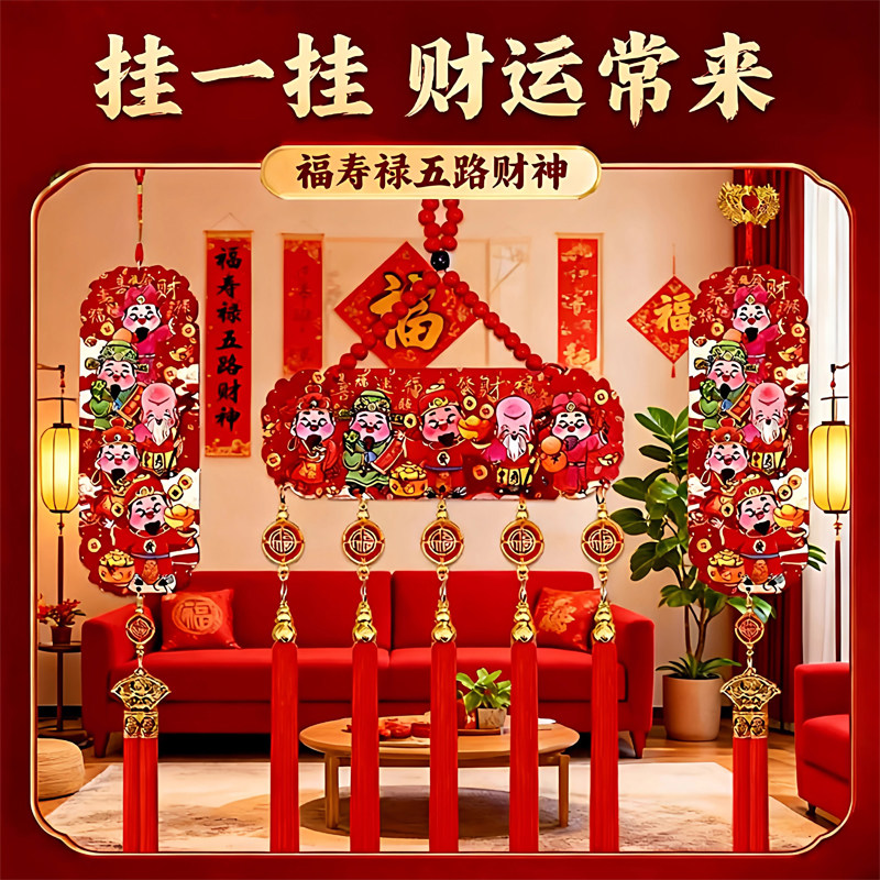 2026新年五路财神福字中国结客厅玄关电视墙装饰过年春节挂件桃木