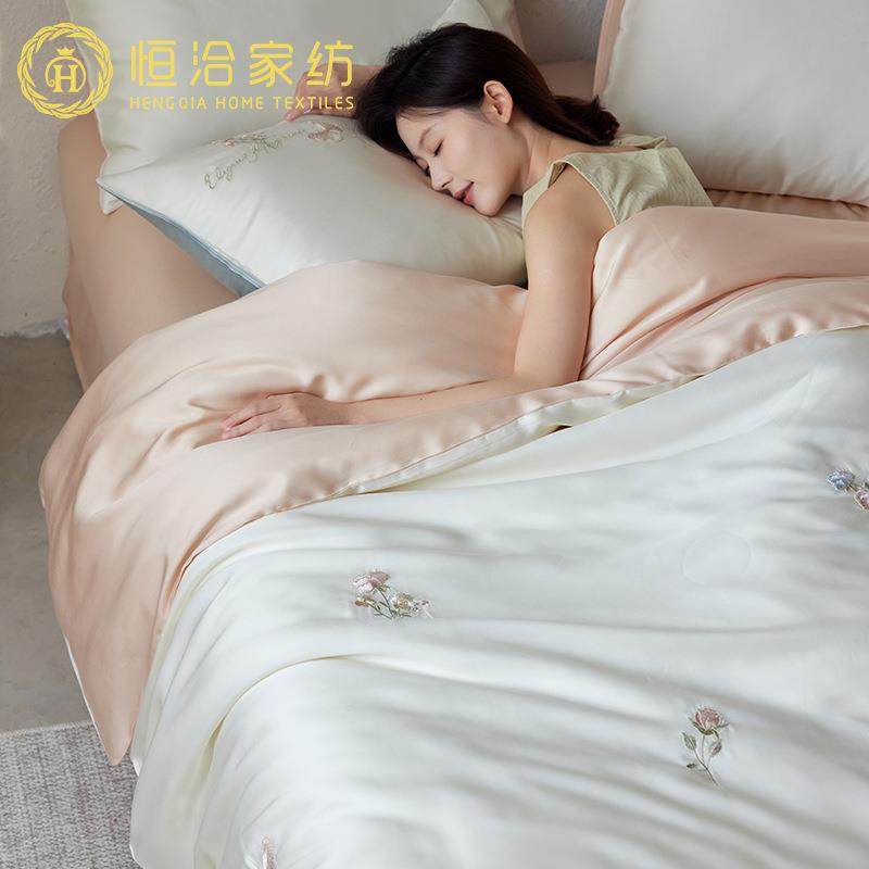 春夏凉感莱赛尔四件套唯美花卉刺绣丝滑少女心1.2m被套床品粉蓝色