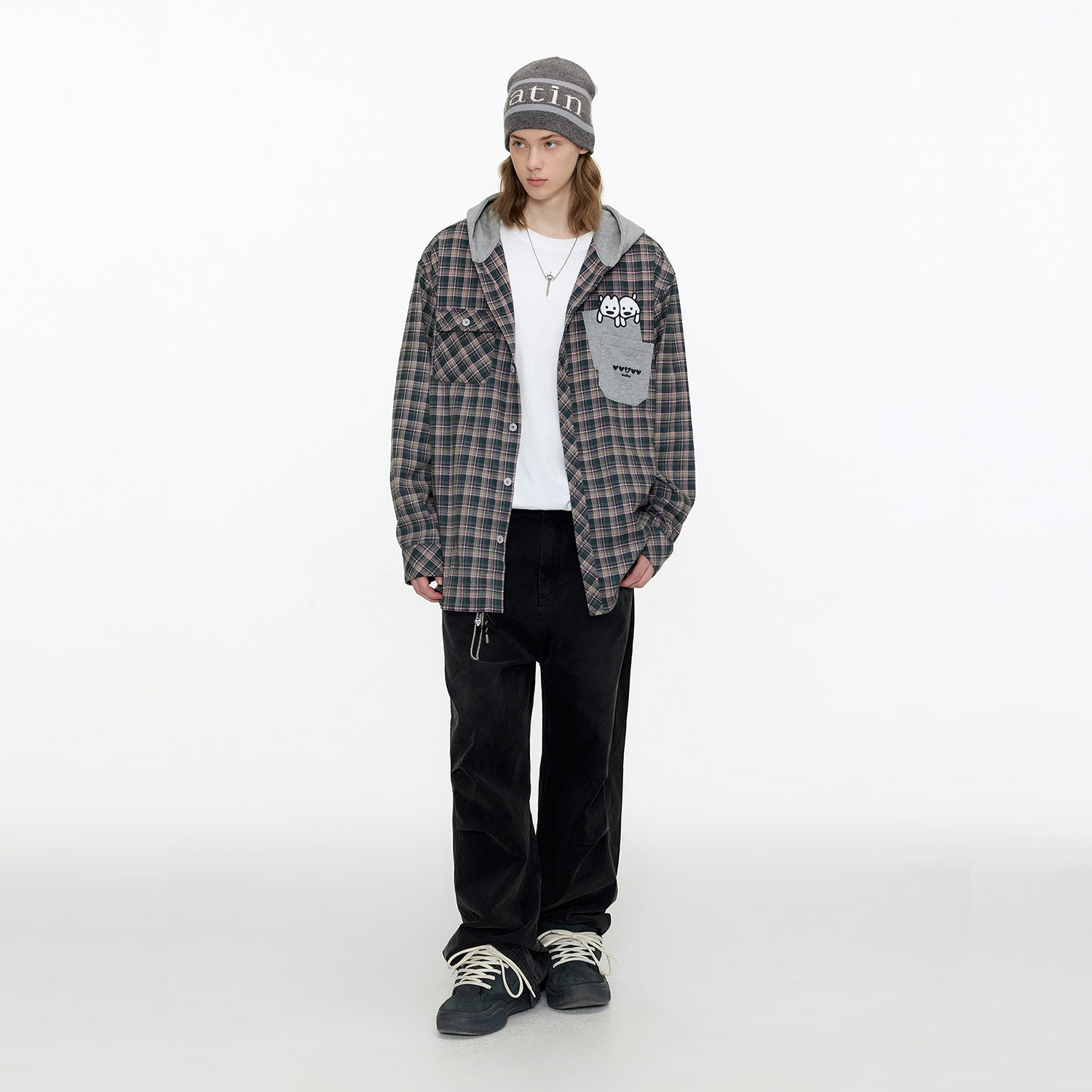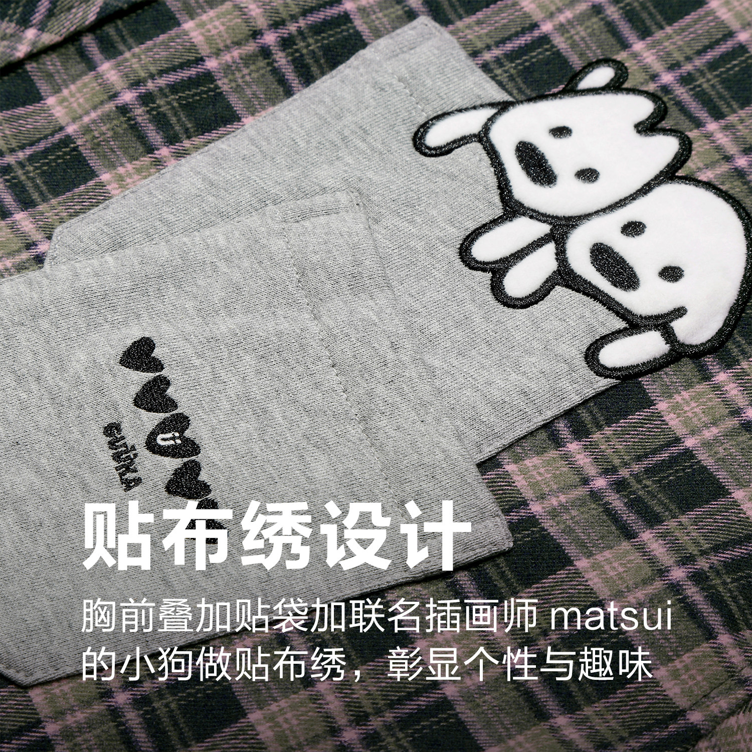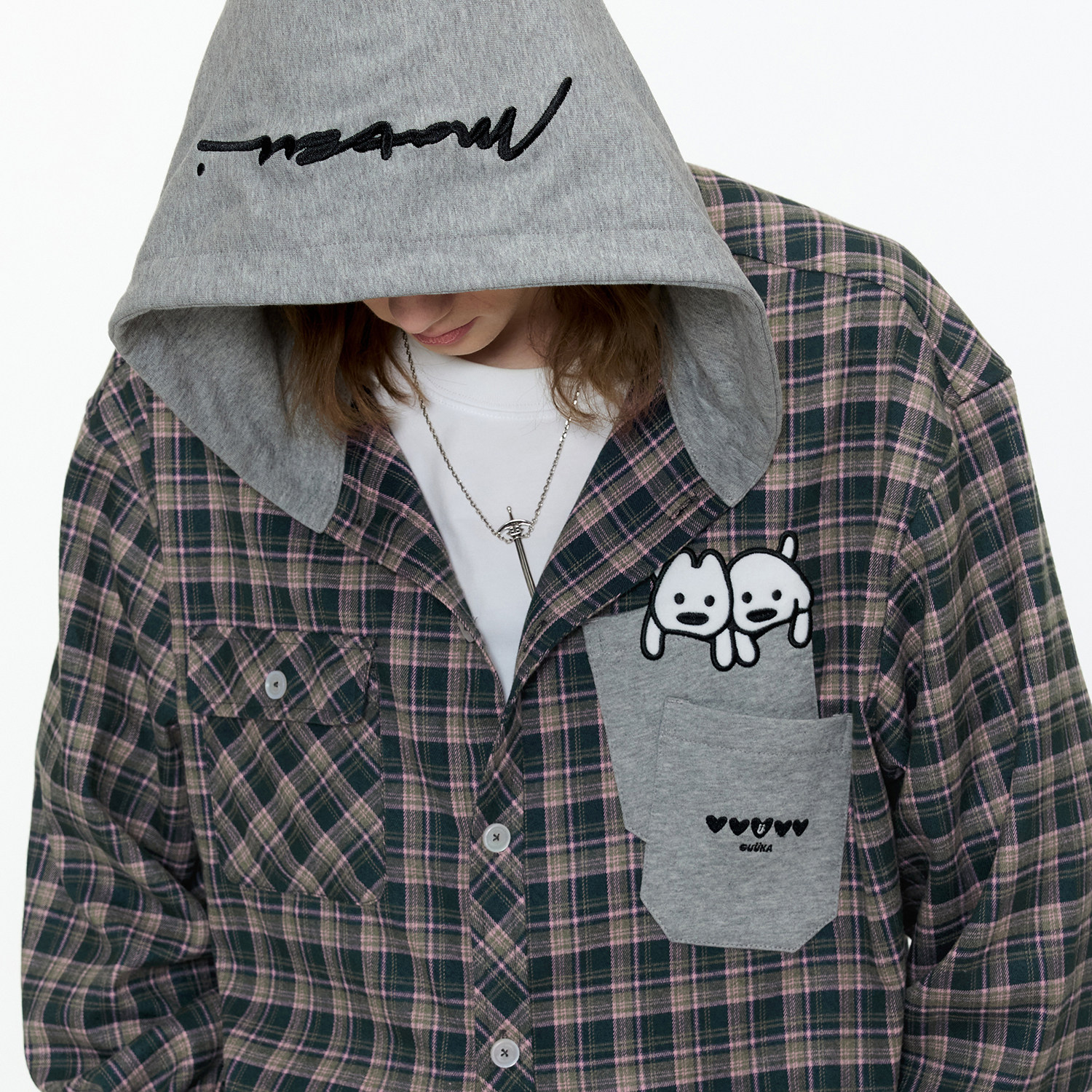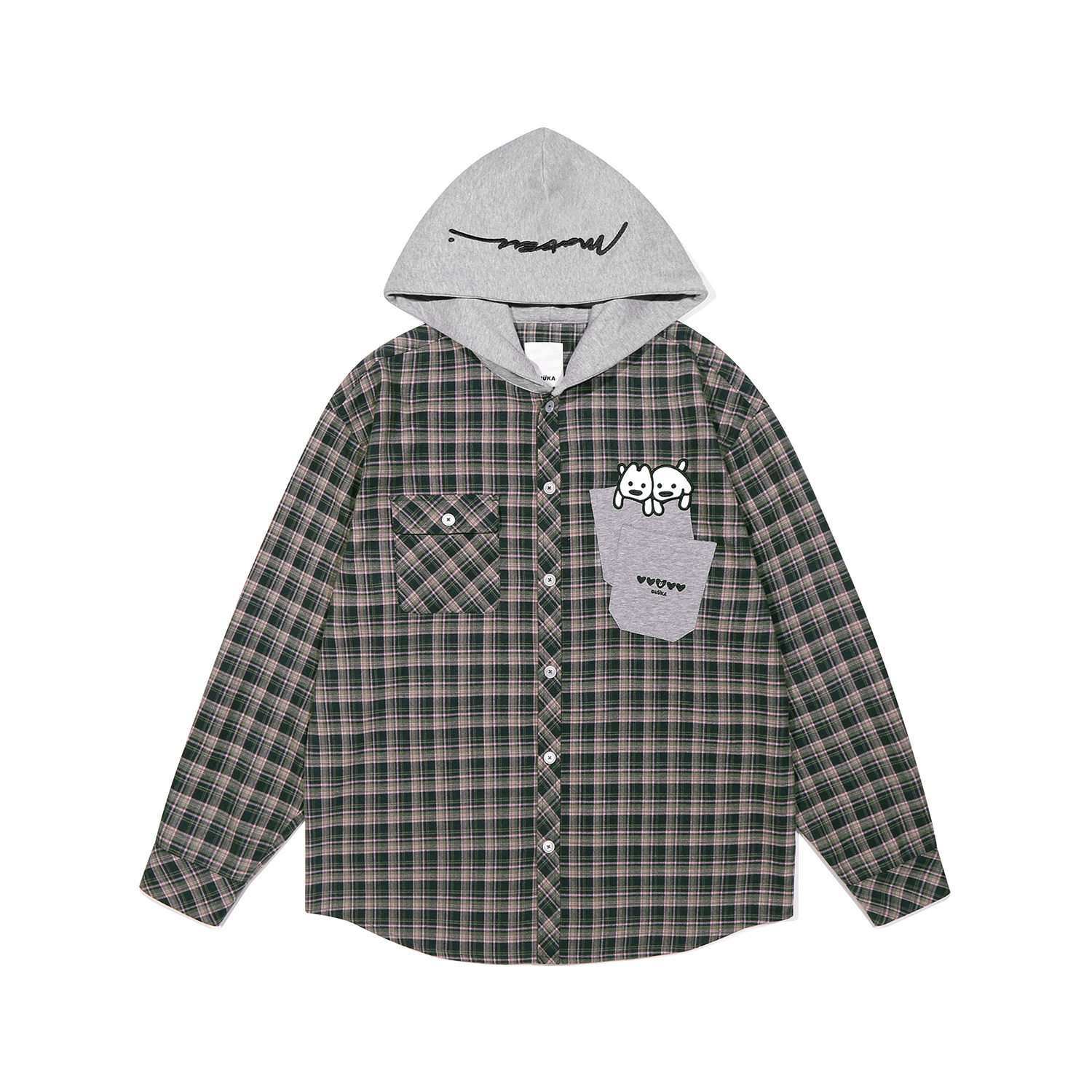 GUUKA&matsui联名美式格子衬衫男款长袖衬衣小狗刺绣正肩连帽外套