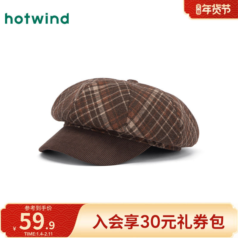 热风女士帽子格纹八角帽2025年冬季新款拼接复古显脸小八角鸭舌帽