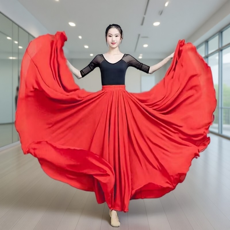 720双层雪纺大摆裙广场舞红裙子新疆舞蹈服装女现代舞半身裙长款