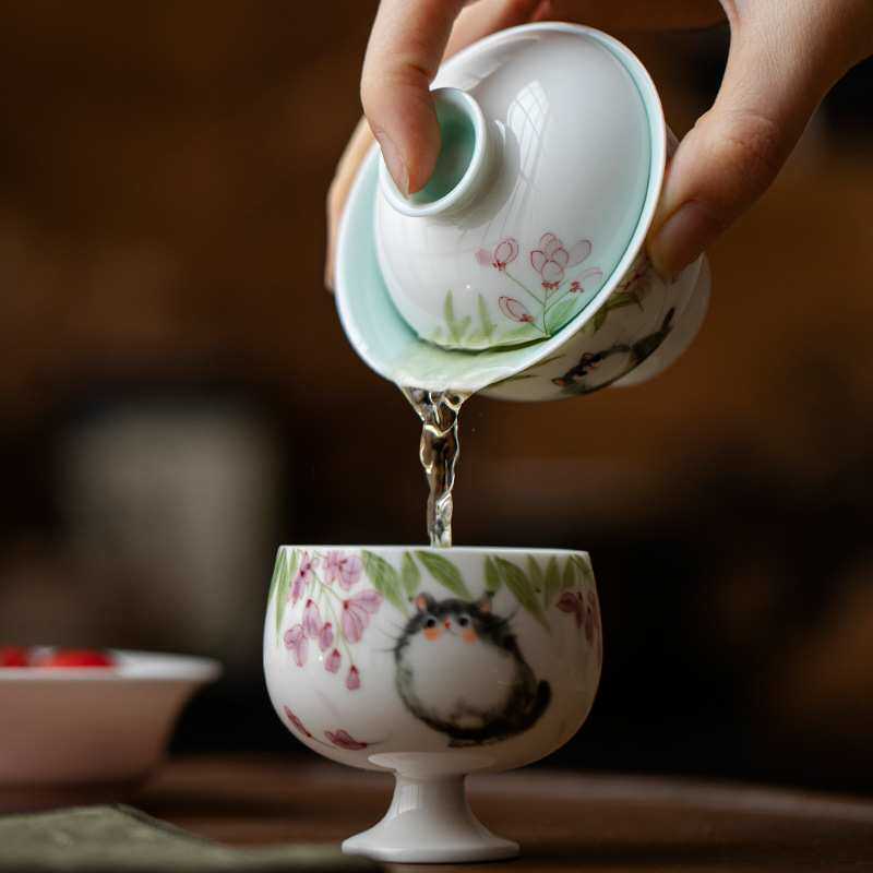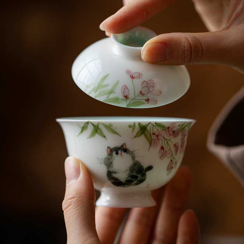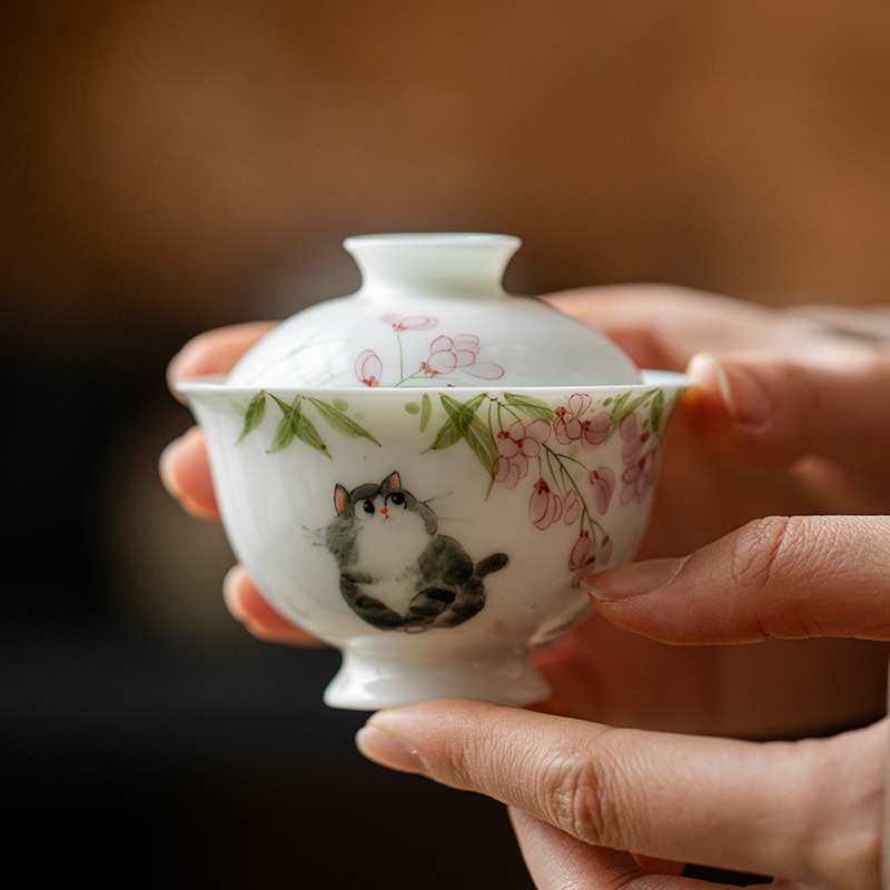 弥言纯手绘布偶猫咪盖碗手工白瓷泡茶碗茶杯单个高档功夫茶具茶碗