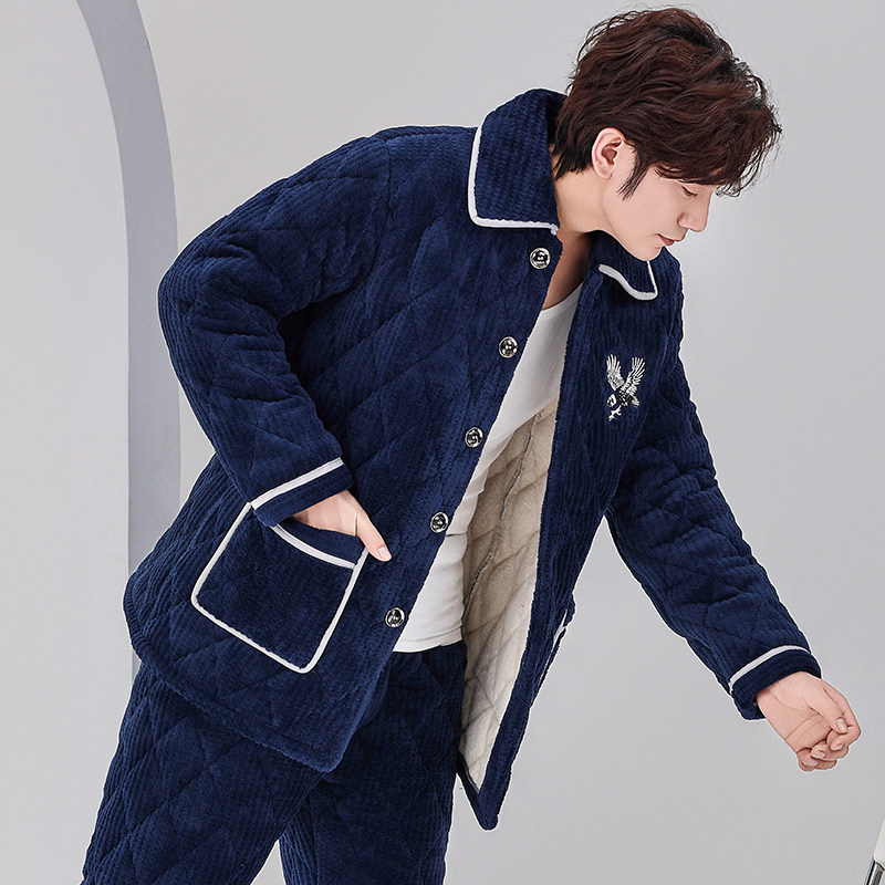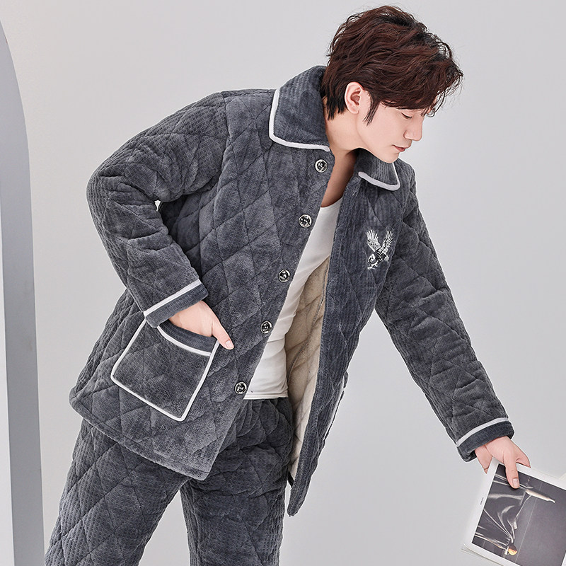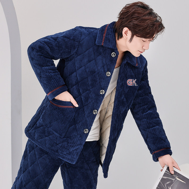 冬季珊瑚绒男士睡衣三层夹棉加厚加绒法兰绒秋冬款家居服保暖套装