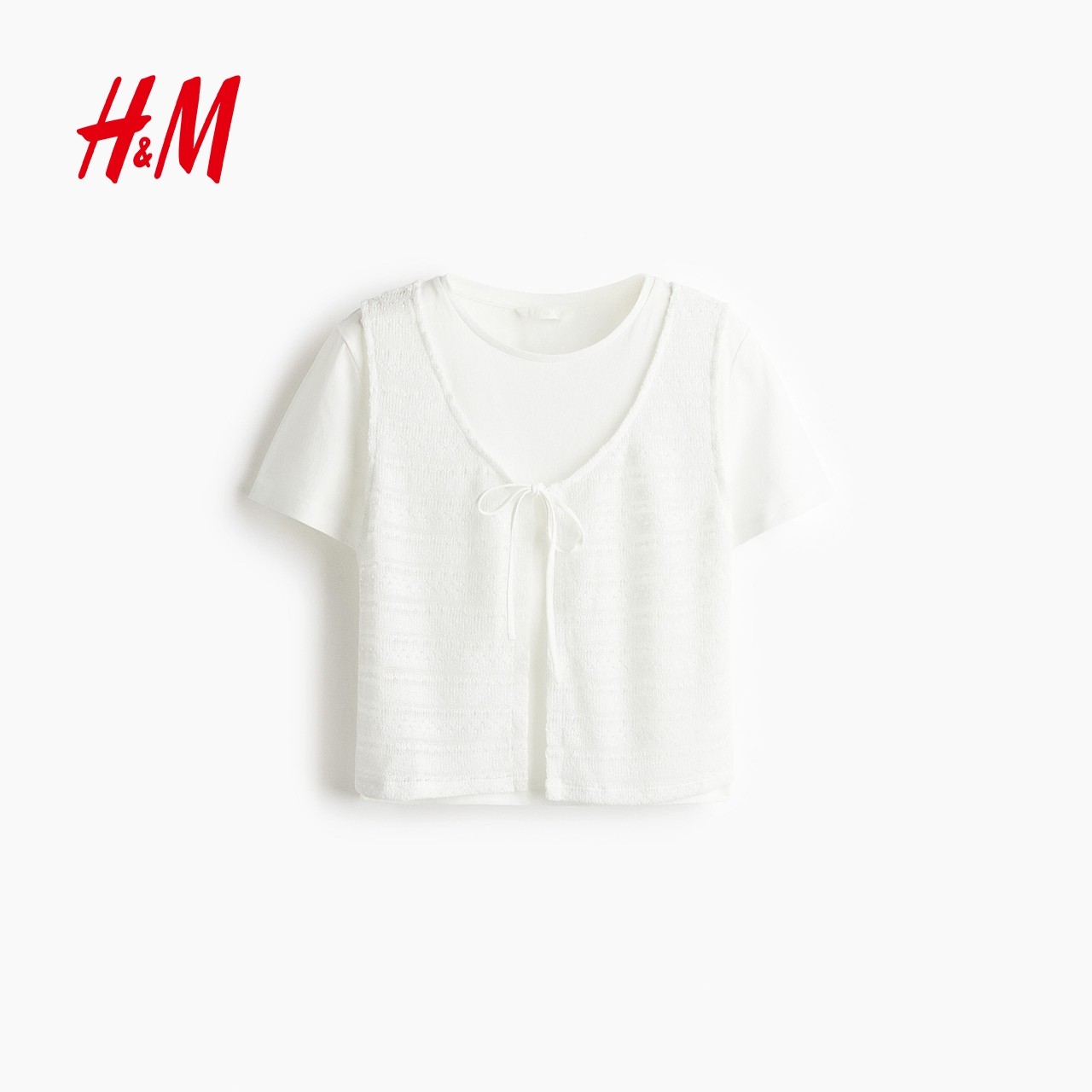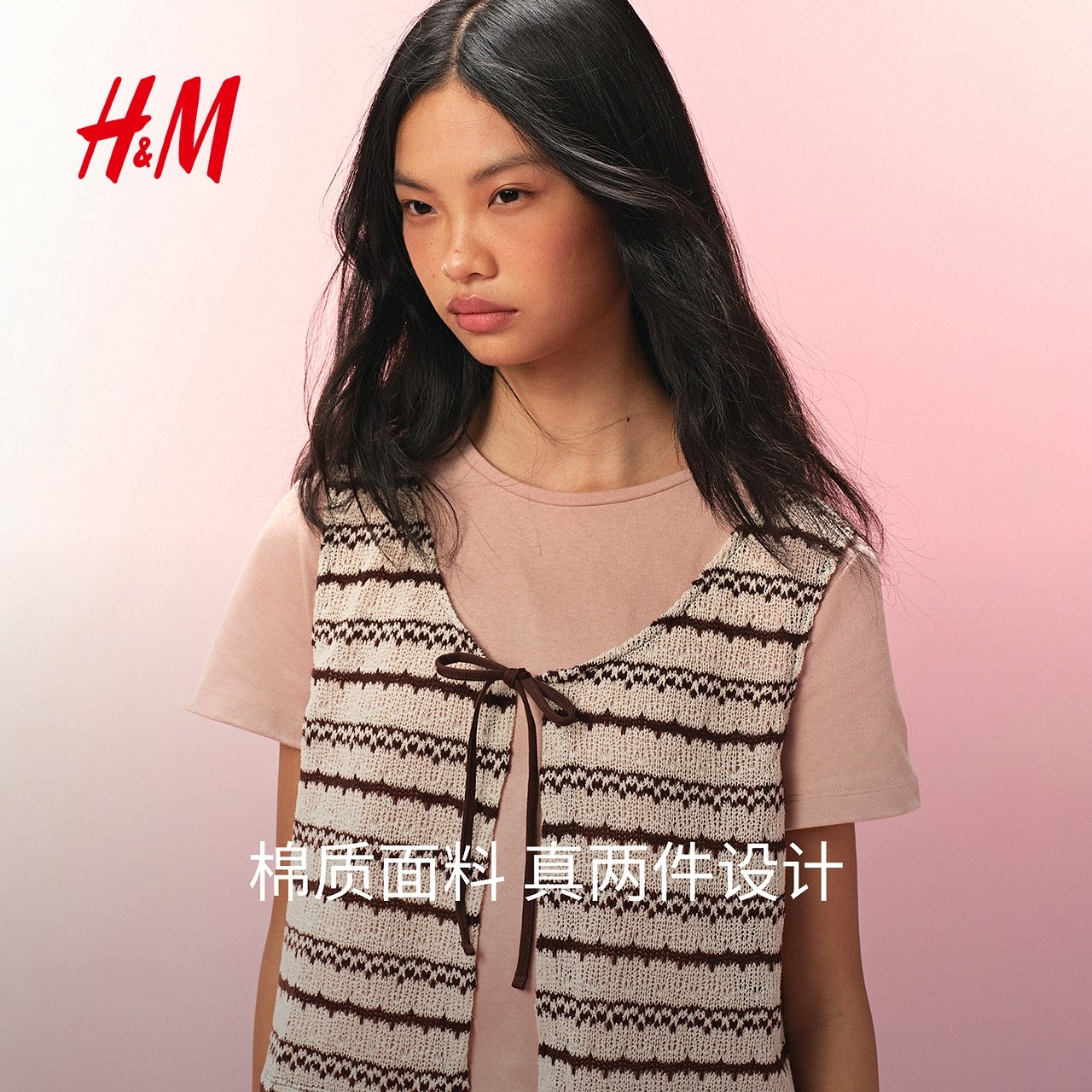 HM女装T恤2025年年冬季新款低圆领系带前襟马甲层叠上衣1309767