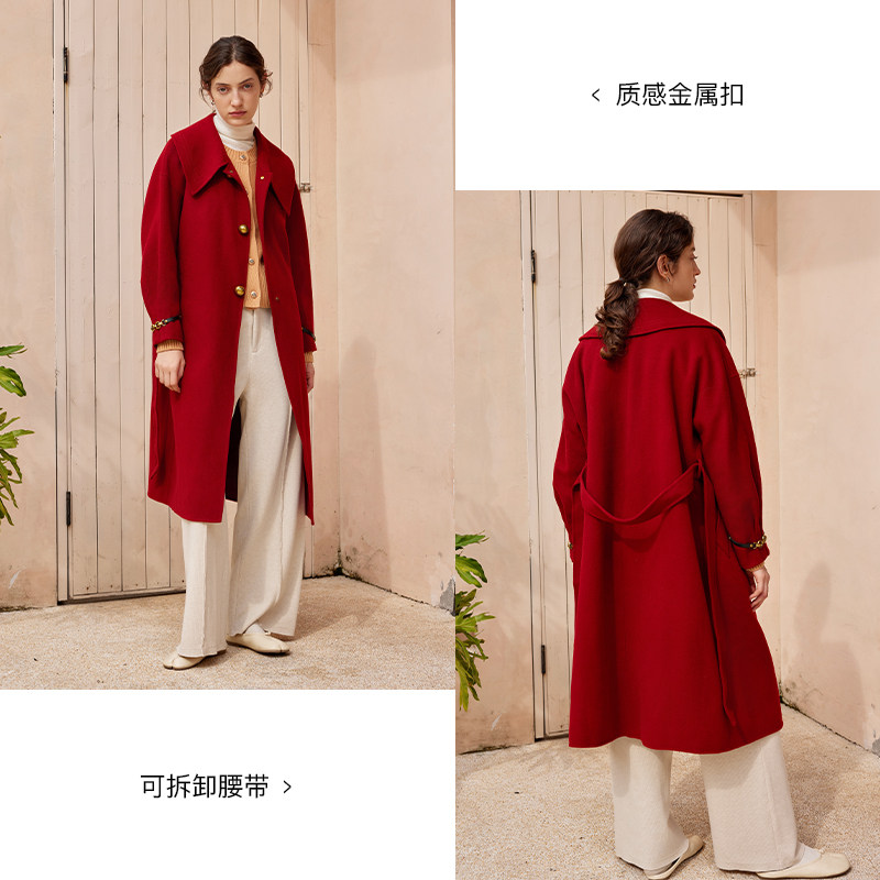 水沐飞高级感酒红色双面羊绒大翻领毛呢大衣女秋冬中长款羊毛外套