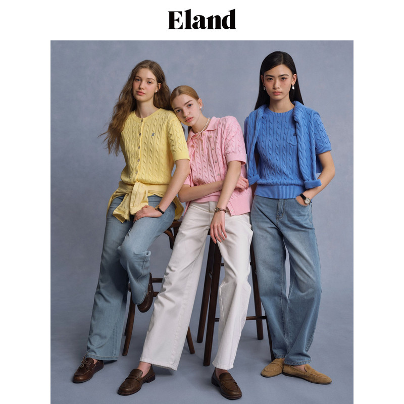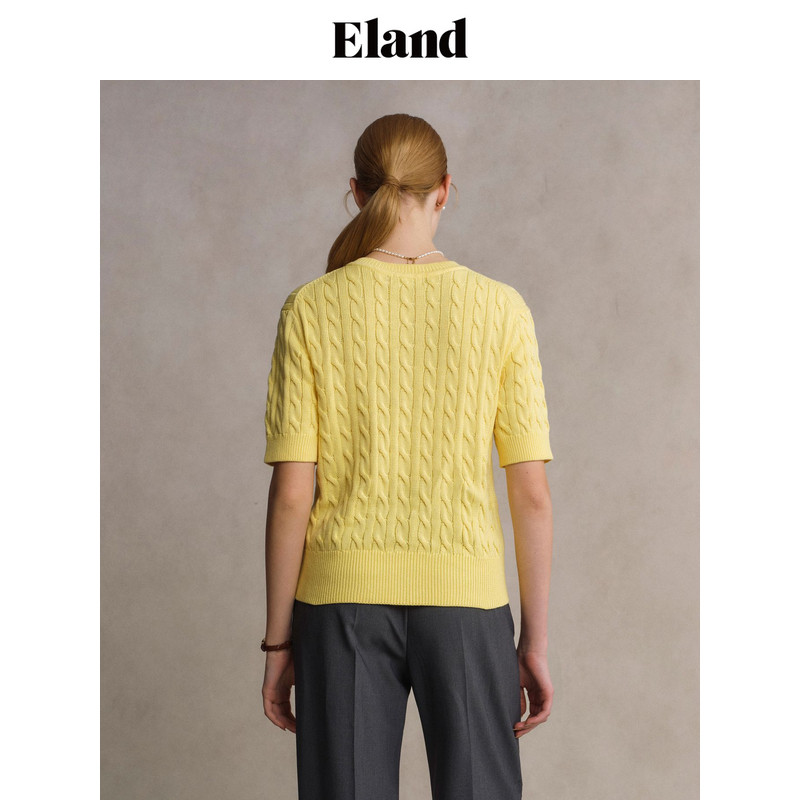 【100%棉】Eland衣恋针织T恤女下摆罗纹绞花短袖上衣2025夏新款