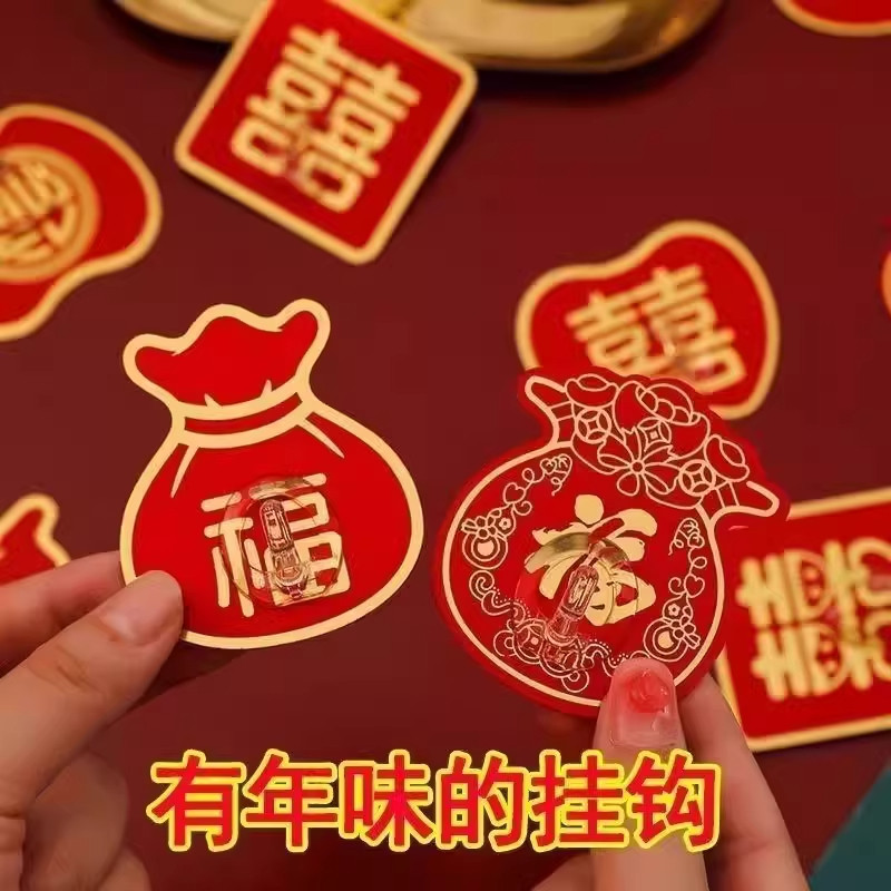 中国红色福字挂钩新年粘钩打孔无痕结婚钩子粘胶喜庆墙上宿舍强力