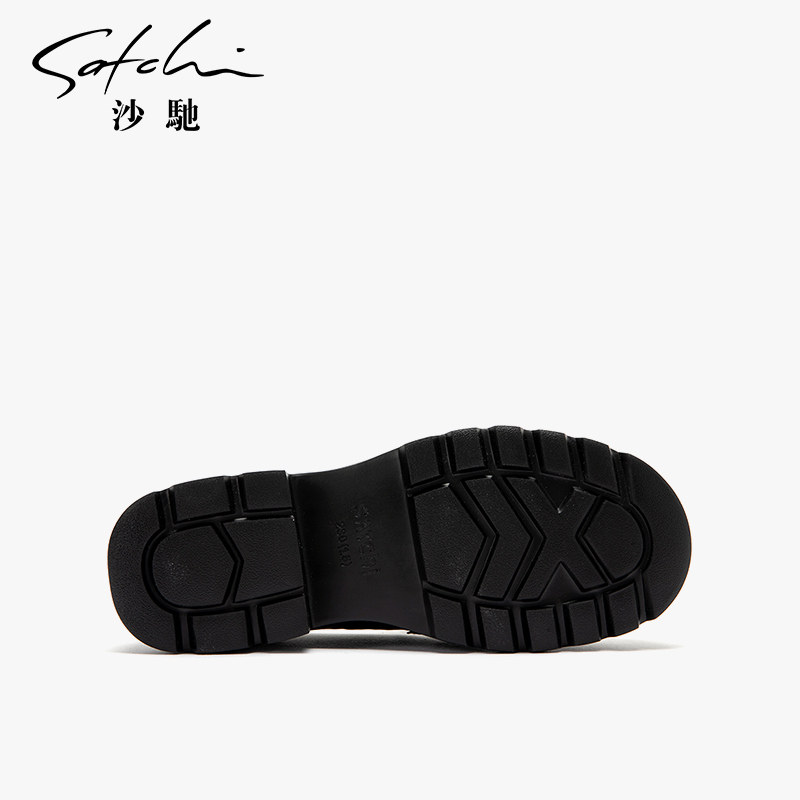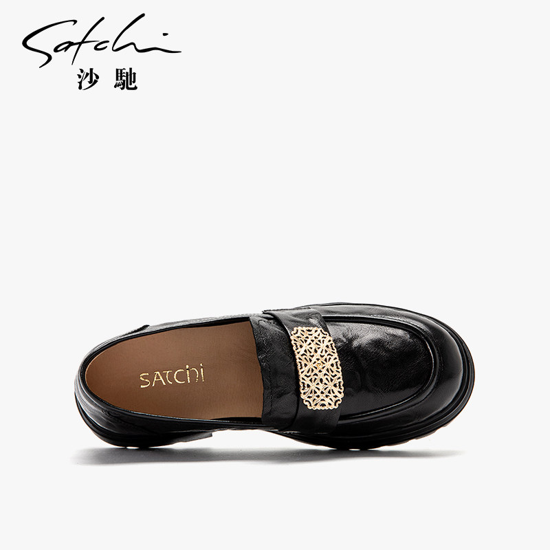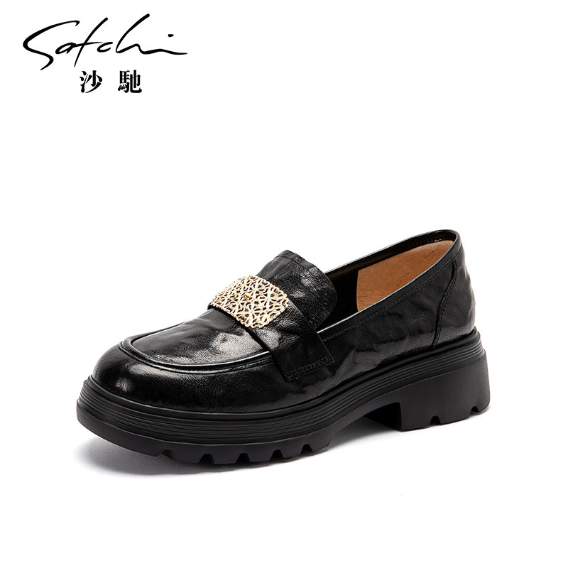 沙驰女鞋黑色方头乐福鞋女2026春季新款深口厚底鞋一脚蹬懒人单鞋