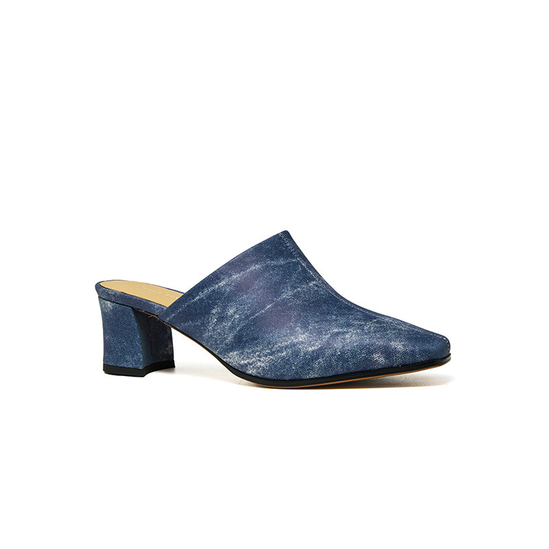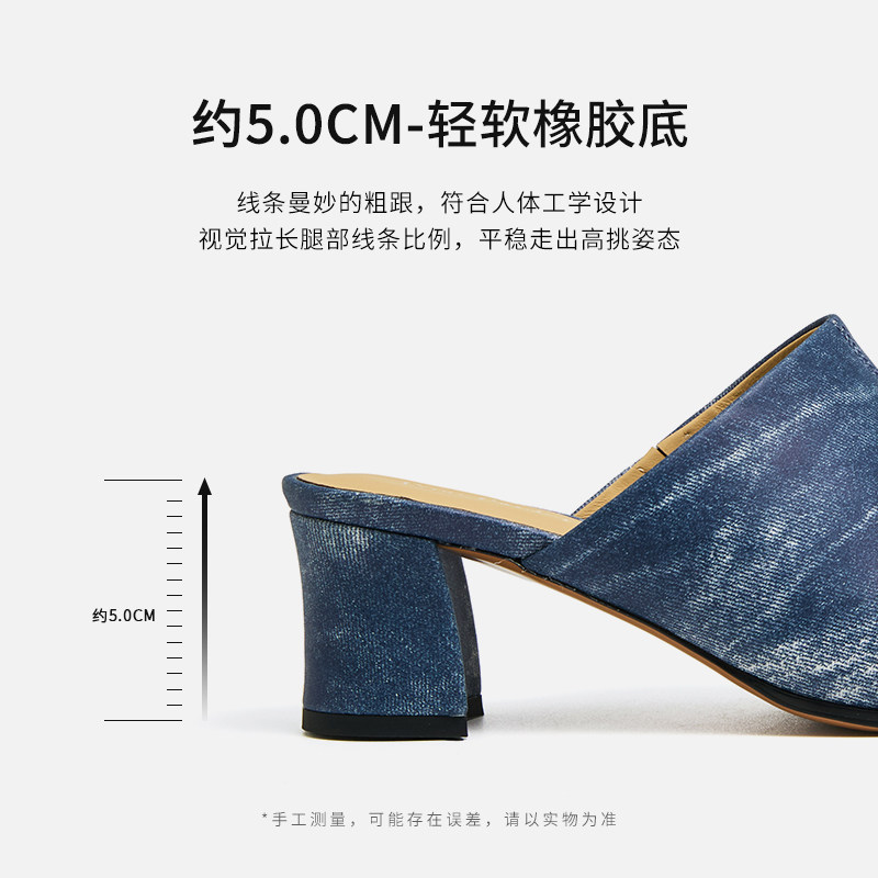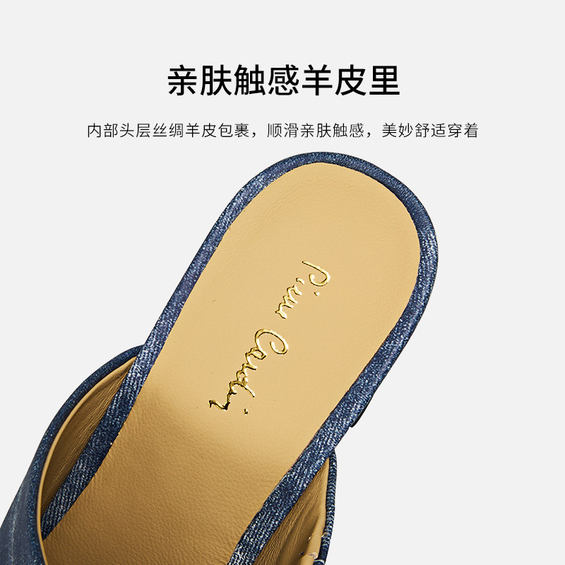 皮尔卡丹女鞋真皮时装凉鞋方头牛仔擦色粗跟前包高跟穆勒鞋单鞋女