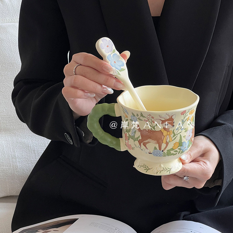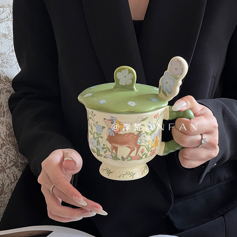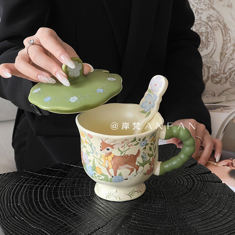 岸梵可爱花间鹿马克杯卡通带盖带勺陶瓷杯子情侣水杯女生新年礼物