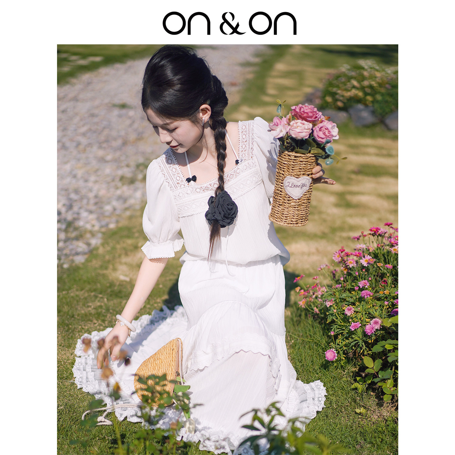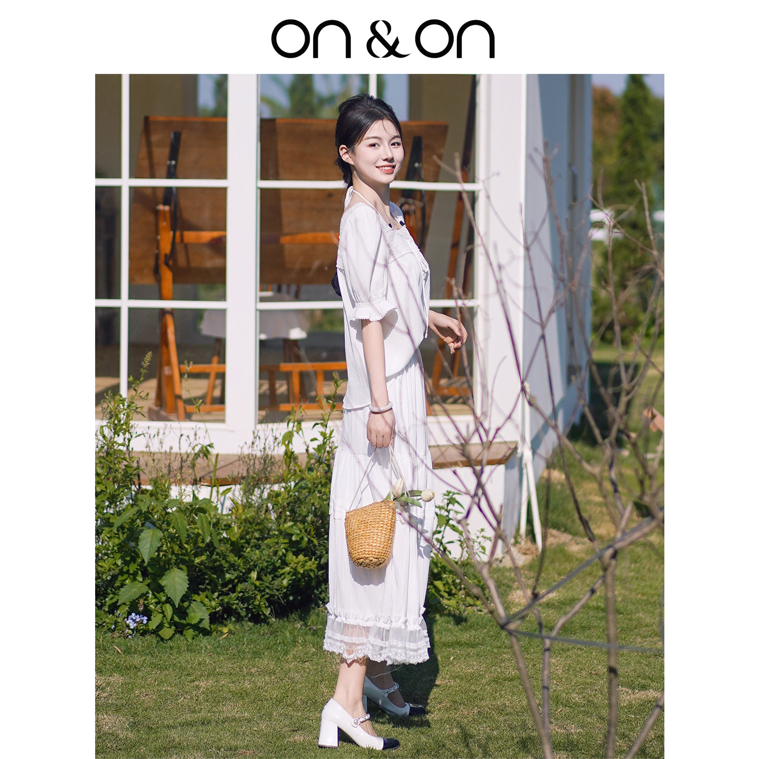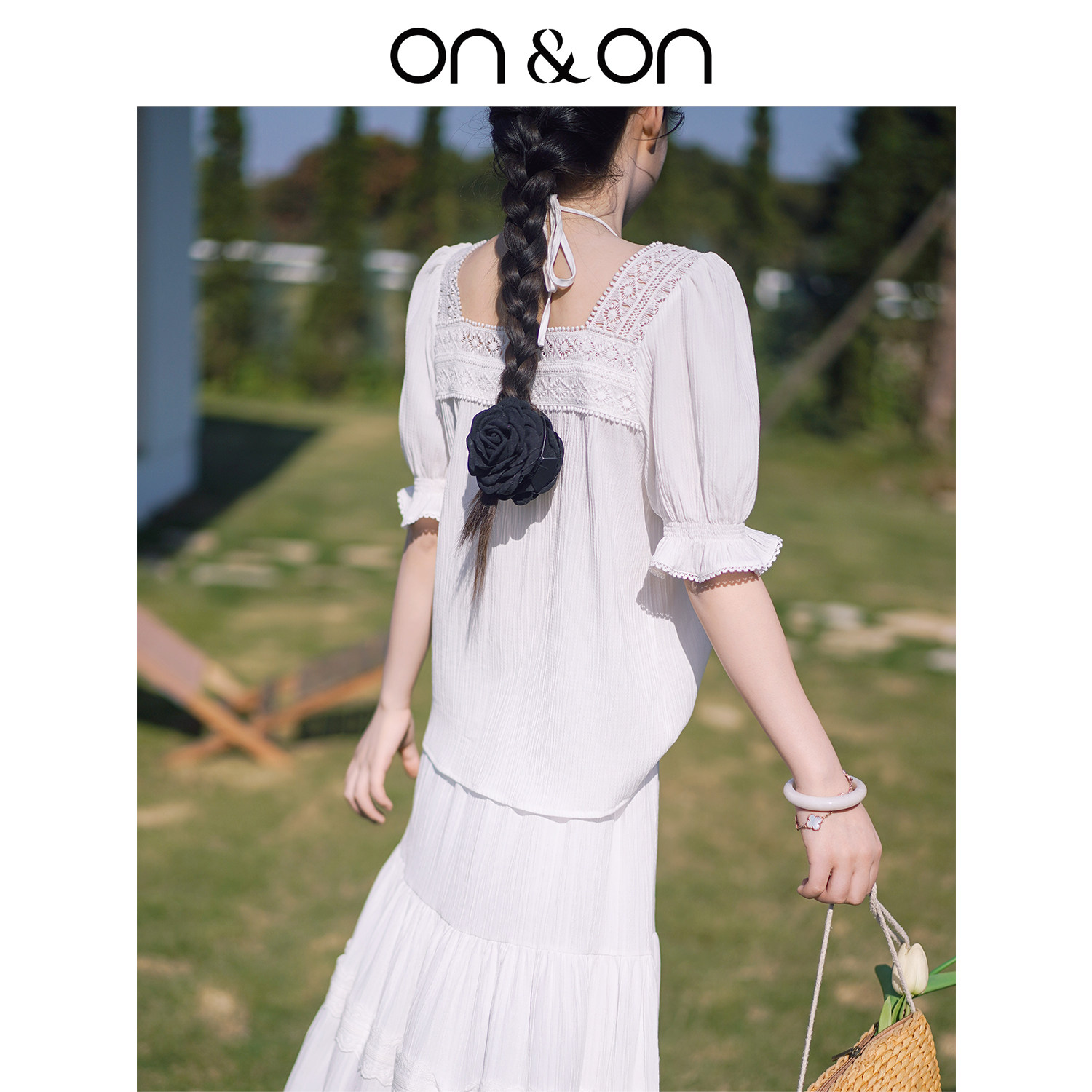 ON&ON/安乃安2026春季新款韩系度假风蕾丝拼接系带小衫+半裙套装