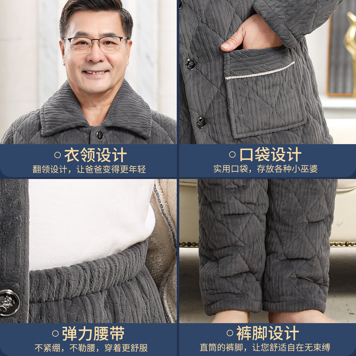 男士睡衣秋冬季三层加厚加绒珊瑚绒夹棉保暖中老年爸爸家居服套装