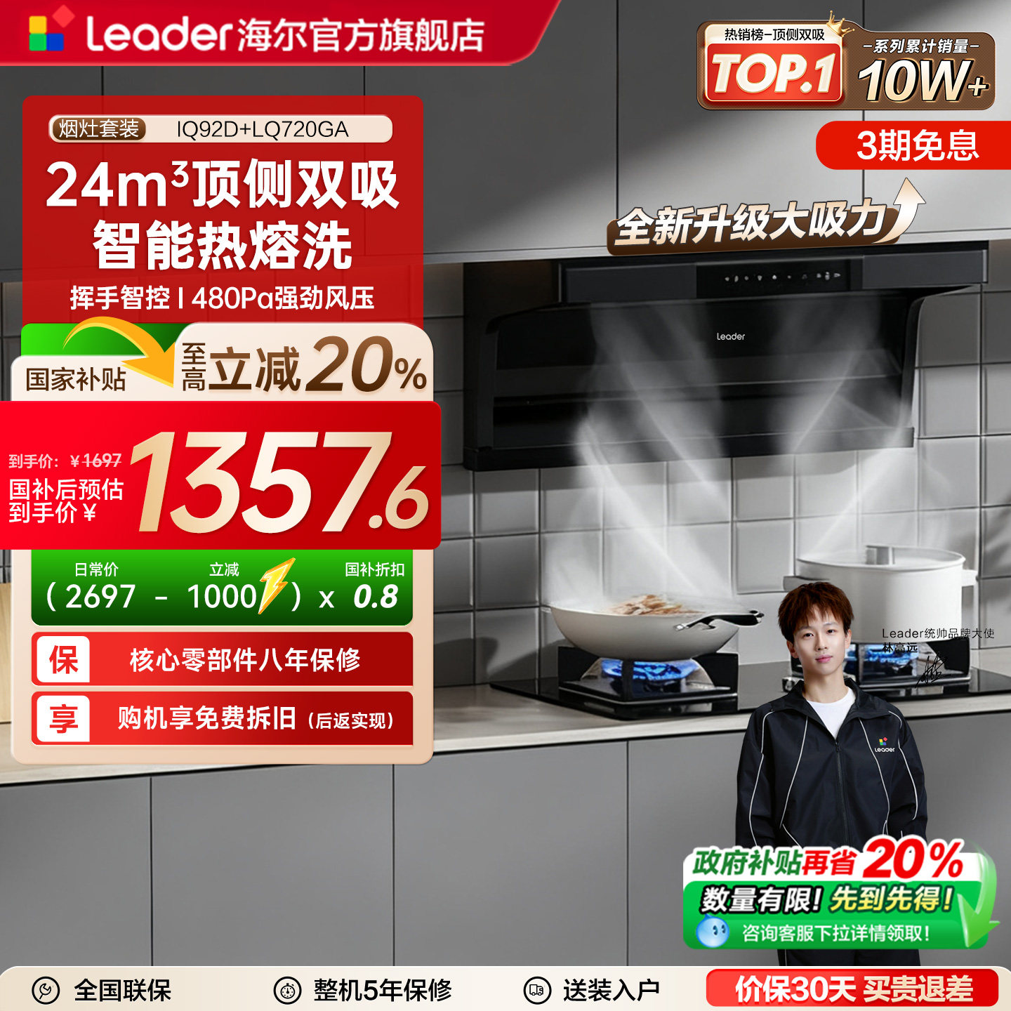 海尔出品统帅抽油烟机燃气灶一套厨房家用顶侧双吸IQ92D烟灶套装