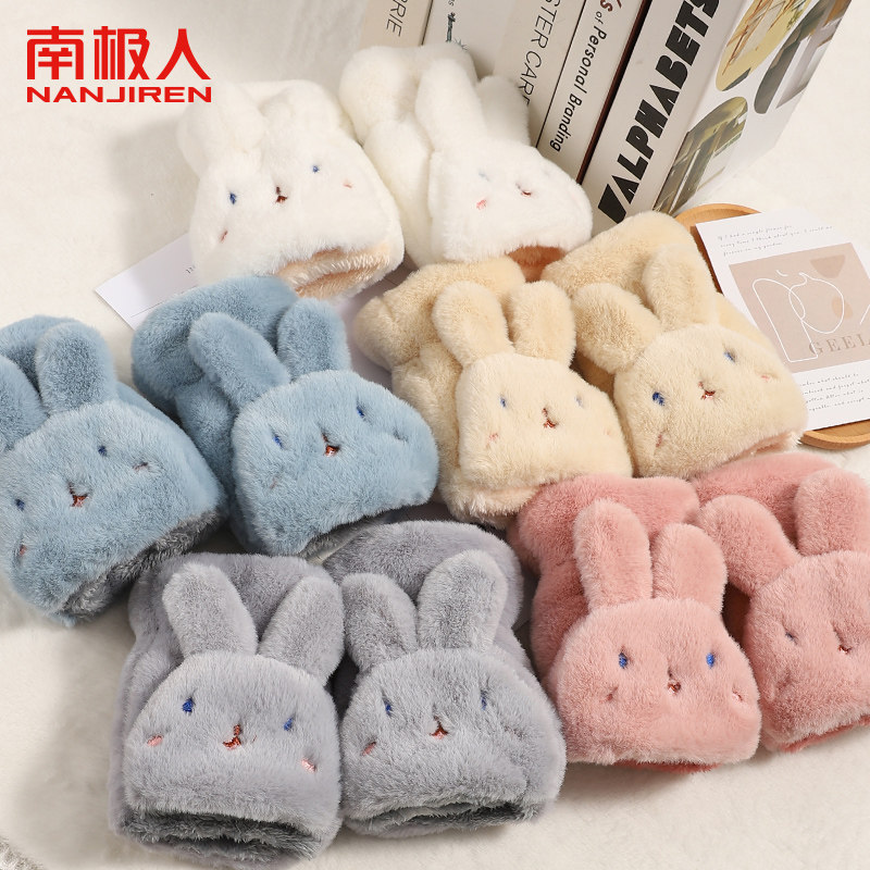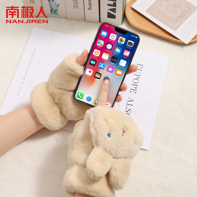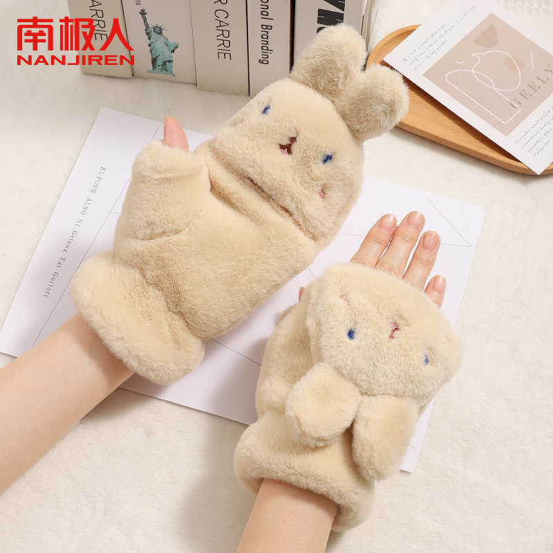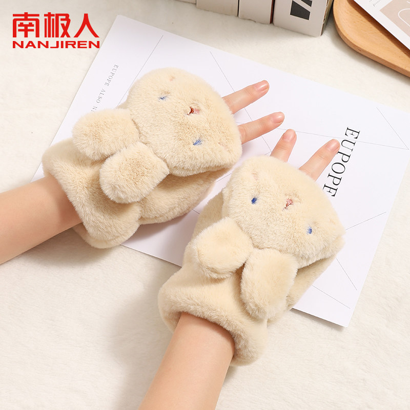 南极人毛绒手套女冬季可爱露手指学生骑行翻盖手套加绒加厚手套H