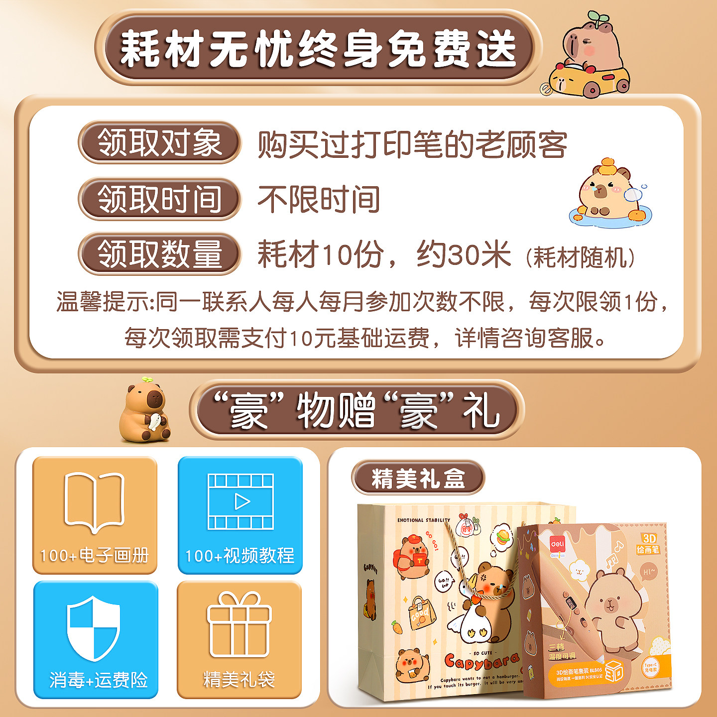 得力3d打印笔儿童款元旦礼物套装卡皮巴拉联名低温不烫手diy立体涂鸦打印机笔3d笔神笔马良男女新年生日礼物