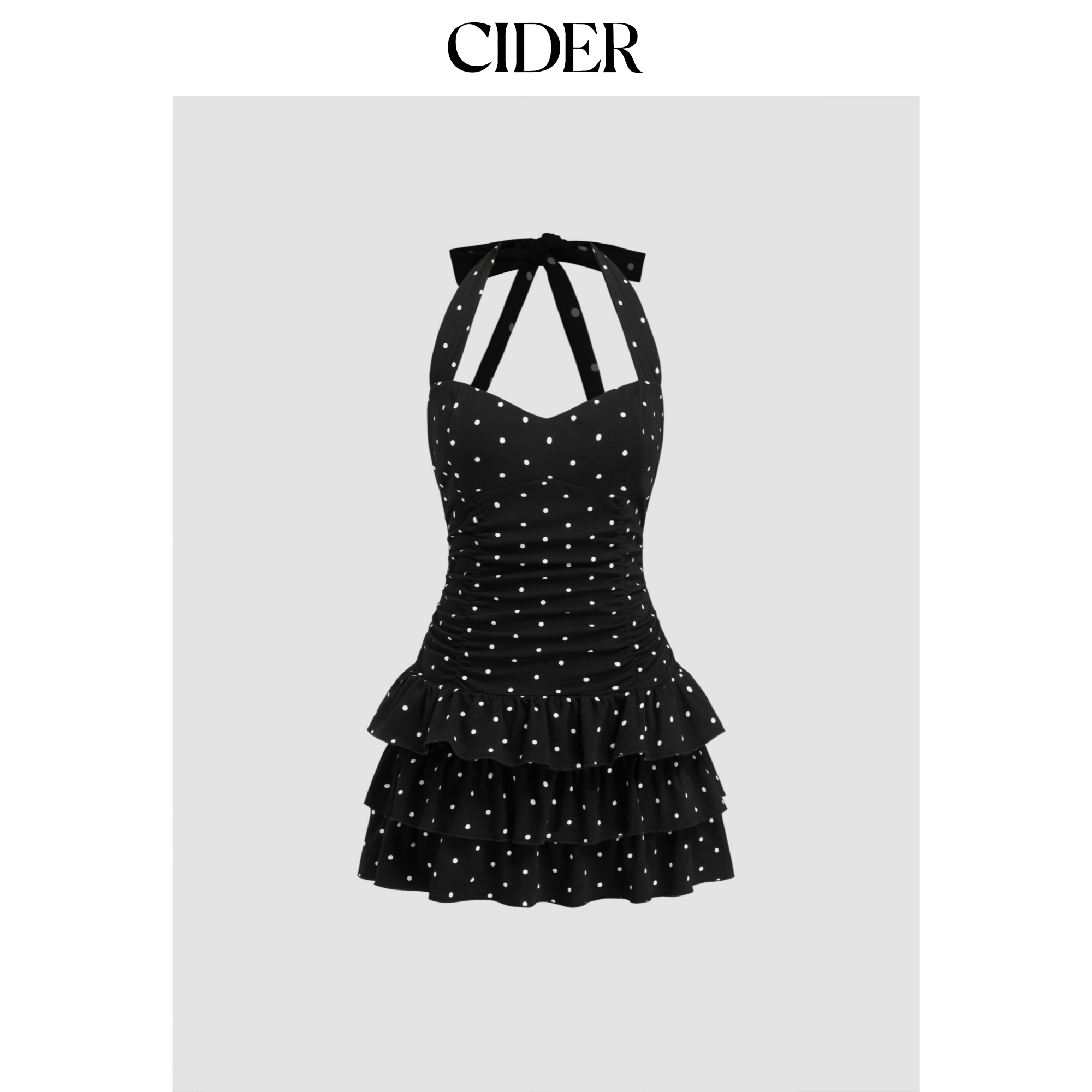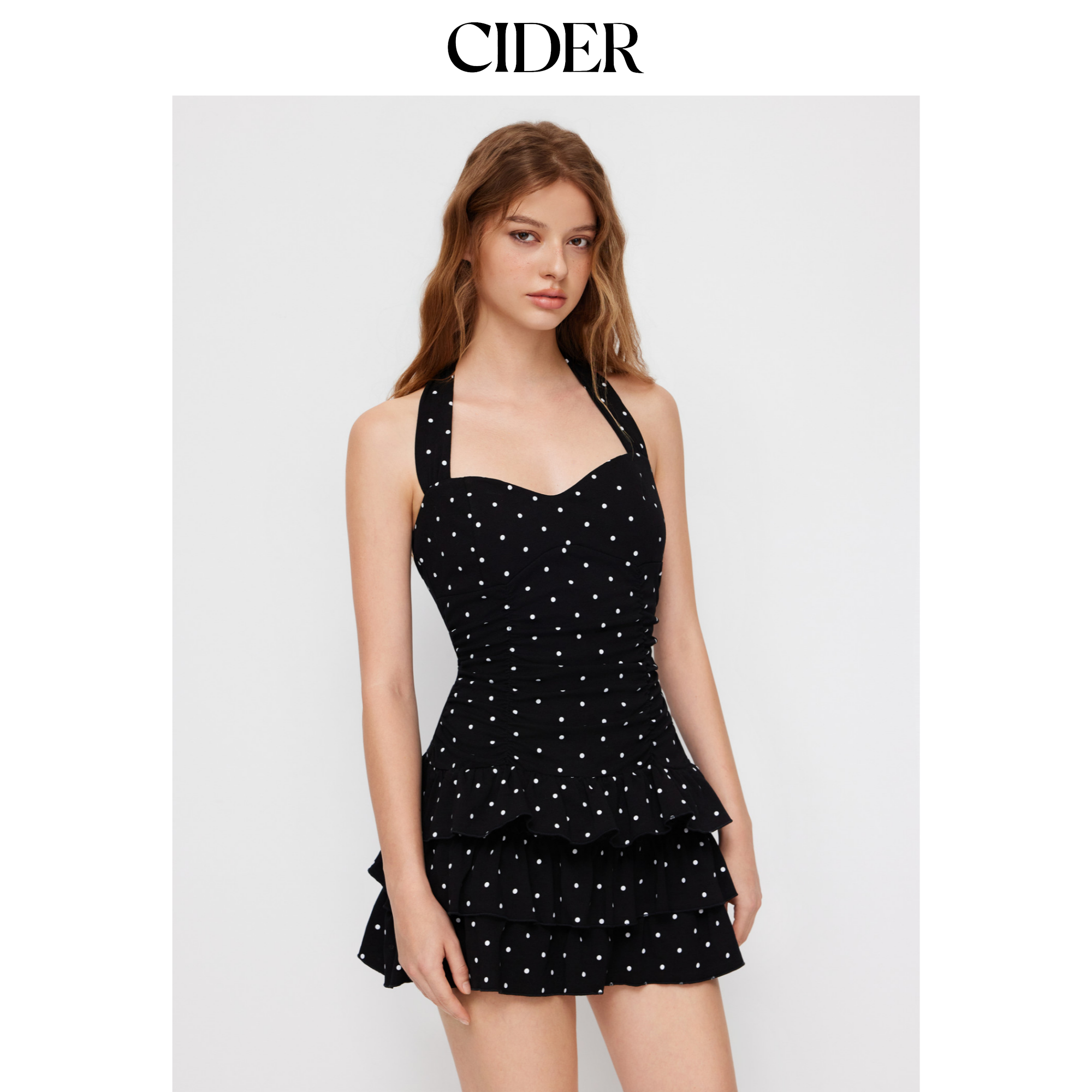 CIDER 棉质挂脖波点裙褶皱层叠迷你吊带连衣裙114668840